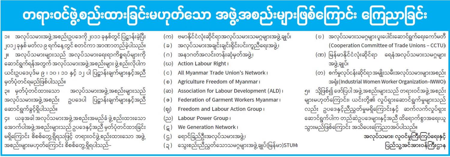 တရားဝင်ဖွဲ့စည်းထားခြင်းမဟုတ်သော အဖွဲ့အစည်းများဖြစ်ကြောင်း ကြေညာခြင်း