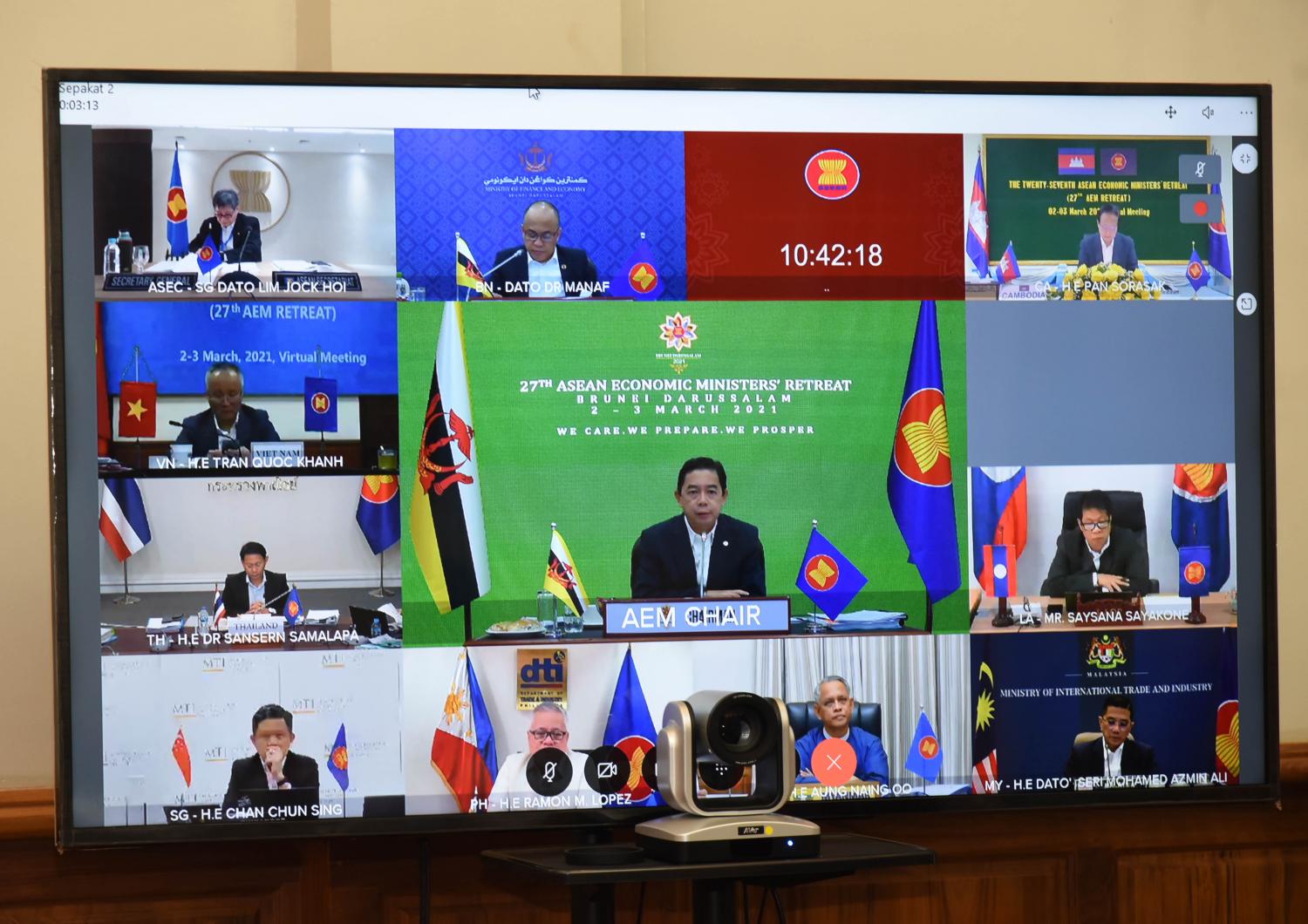 အစည်းအဝေး(ဒုတိယနေ့)တွင် အာဆီယံ ဘက်စုံပြန်လည်ထူထောင်ရေး မူဘောင်၌ အာဆီယံစီးပွားရေးအသိုက်အဝန်း(အေအီးစီ) နှင့်ပတ်သက်သောကိစ္စရပ်များ အကောင် အထည်ဖော်မှု၊ ကိုဗစ်-၁၉ ကပ်ရောဂါကို တုံ့ပြန်ရန်အတွက် ရေးဆွဲချမှတ်ခဲ့သည့် ဟနွိုင်းရှေ့ လုပ်ငန်းစဉ်အောက်ရှိ အရေးကြီးကုန်စည်များအပေါ် အကောက်ခွန်မဟုတ်သော စီမံဆောင် ရွက်မှုများ ချမှတ်အကောင်အထည်ဖော်ခြင်းဆိုင်ရာ နားလည်မှုစာချွန်လွှာ၏ နောက်ဆက်တွဲ အရေးကြီးကုန်စည်များစာရင်းတွင် လယ်ယာထွက်ကုန်နှင့် စားသောက် ကုန်စည်များ ထပ်မံ ထည့်သွင်းရေးကိစ္စ၊ ကမ္ဘာ့ထုတ်လုပ်မှုကွင်းဆက်တွင် အာဆီယံအနေဖြင့် ပိုမိုပူးပေါင်းပါဝင် နိုင်ရေးကိစ္စနှင့် ဒေသတွင်း ဘက်စုံပူးပေါင်းဆောင်ရွက်ရေး သဘောတူစာချုပ် အာဏာသက် ဝင်ရေးအတွက် နိုင်ငံအလိုက်ဆောင်ရွက်မှုများကို ဆွေးနွေးသည်။