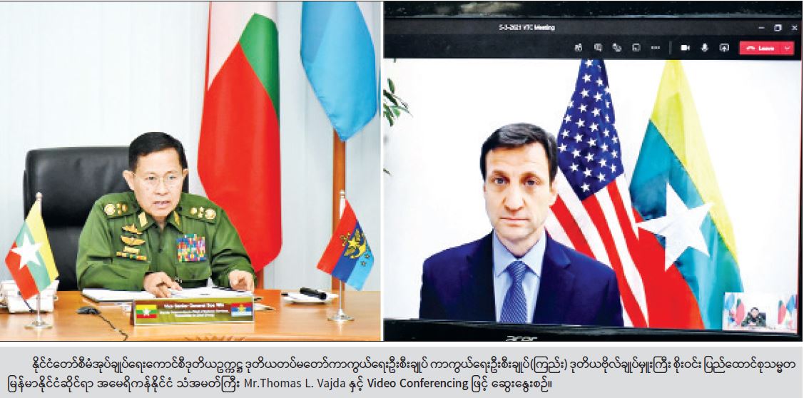 နိုင်ငံတော်စီမံအုပ်ချုပ်ရေးကောင်စီ ဒုတိယဥက္ကဋ္ဌ ဒုတိယတပ်မတော် ကာကွယ်ရေးဦးစီးချုပ် ကာကွယ် ရေးဦးစီးချုပ်(ကြည်း) ဒုတိယဗိုလ်ချုပ်မှူးကြီး စိုးဝင်းသည် ပြည်ထောင်စုသမ္မတ မြန်မာနိုင်ငံ ဆိုင်ရာ အမေရိကန်နိုင်ငံ သံအမတ်ကြီး Mr.Thomas L. Vajda အား ယနေ့ နံနက်ပိုင်းတွင် Video Conferencing G¢ 603.28 ဆွေးနွေးသည်။