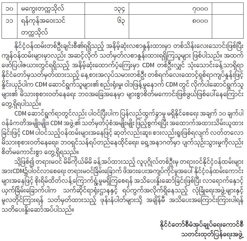 နိုင်ငံ့ဝန်ထမ်းများအနေဖြင့် CDM တွင် မနစ်မွန်းစေရေး သတိပေးထုတ်ပြန်ချက်