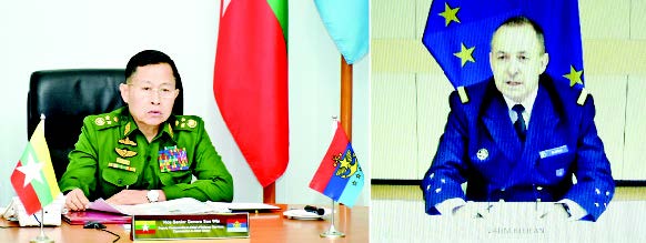 နိုင်ငံတော်စီမံအုပ်ချုပ်ရေးကောင်စီ ဒုတိယဥက္ကဋ္ဌ ဒုတိယတပ်မတော်ကာကွယ်ရေးဦးစီးချုပ် ကာကွယ်ရေးဦးစီးချုပ် (ကြည်း) ဒုတိယ ဗိုလ်ချုပ်မှူးကြီး စိုးဝင်းသည် Head of the European Union Military Staff (EUMS) ဖြစ်သူ Vice Admiral Herve Blejean နှင့် ယနေ့မွန်းလွဲပိုင်းတွင် Video Conferencing ဖြင့် တွေ့ဆုံဆွေးနွေးသည်။