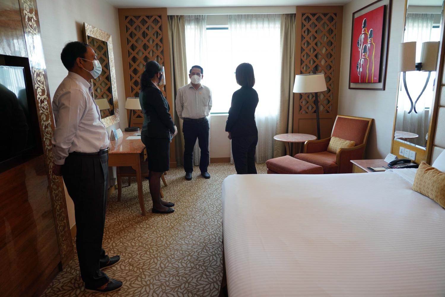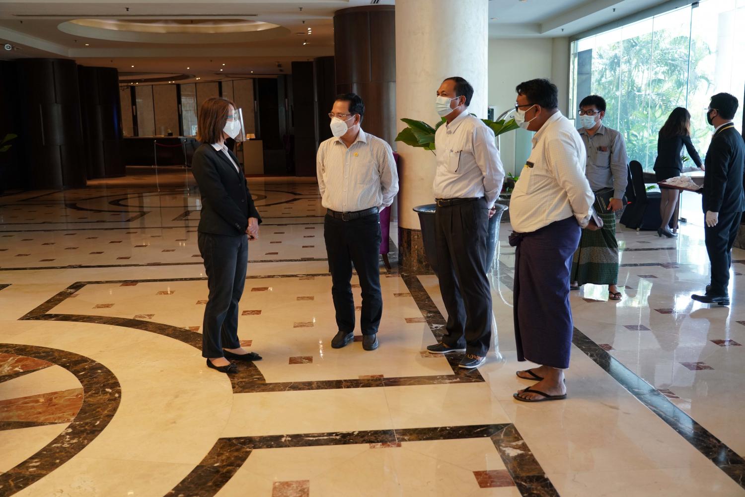ဆက်လက်၍ ပြည်ထောင်စုဝန်ကြီးသည် ကန်တော်ကြီး ဥယျာဉ်အတွင်းရှိ ကရဝိတ်ခန်းမသို့ ရောက်ရှိရာ တာဝန်ရှိသူက ခန်းမနှင့်ပတ်သတ်၍ ရှင်းလင်းတင်ပြမှုအပေါ် သန့်ရှင်းသာယာ လှပရေးအတွက်လိုအပ်သည်များ ဆွေးနွေးမှာကြားခဲ့ပြီး ကရဝိတ်ခန်းမအားလှည့်လည် ကြည့်ရှု သည်။ ထို့နောက် ကိုဗစ်-၁၉ ဆိုင်ရာ သတ်မှတ်ချက်များနှင့်အညီ ဖွင့်လှစ်လျက်ရှိသည့် Chatrium Hotel ၊ Sedona Hotel နှင့် Lotte Hotel များသို့သွားရောက်ခဲ့ပြီး ဟိုတယ်များမှ တာဝန်ရှိ သူများက ဟိုတယ်ဆိုင်ရာကိစ္စရပ်များနှင့် ကိုဗစ်-၁၉ နှင့်အညီ ဧည့်သည်များကို ဝန်ဆောင်မှုပေး သည့် အခြေအနေများကို ရှင်းလင်းတင်ပြရာ ပြည်ထောင်စုဝန်ကြီးက ကိုဗစ်-၁၉ သတ်မှတ်ချက် များကို အထူးအလေးအနက် ထားလိုက်နာဆောင်ရွက်သွားရန်၊ ခရီးသွား ဧည့်သည်များနှင့် အဓိက ထိတွေ့သည့် ဟိုတယ်ဝန်ထမ်းများအား ကိုဗစ်-၁၉ ကာကွယ်ဆေး ဦးစားပေး ထိုးနှံပေးနိုင်ရေး အတွက် ဝန်ထမ်း အင်အားစာရင်း ကြိုတင်ပြုစုထားရှိရန်၊ ခရီးသွား လုပ်ငန်းများ စတင်ပြီဖြစ် သည့်အတွက် လာရောက် တည်းခိုသည့် ခရီးသွားဧည့်သည်များအား ကိုဗစ်-၁၉ ရောဂါကာကွယ် ရေး ဆိုင်ရာများကို အထူးအလေးထားလိုက်နာနိုင်ရေး အသိပေး ဆောင်ရွက်သွားရန်နှင့် ဟိုတယ်ဝန်ထမ်းများအနေဖြင့်လည်း ခရီးသွားဧည့်သည်များကို ပိုမို ကောင်းမွန်သော ဝန်ဆောင်မှုပေးနိုင်ရေး အလေးထားဆောင်ရွက်သွားရန် ပြောကြားခဲ့ကြောင်း သိရသည်။