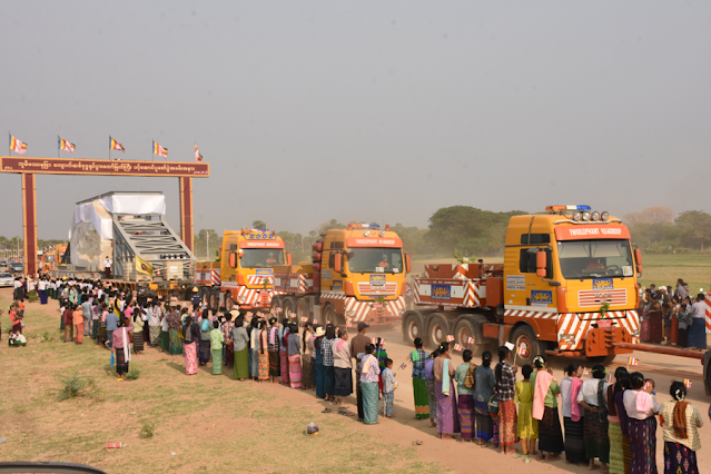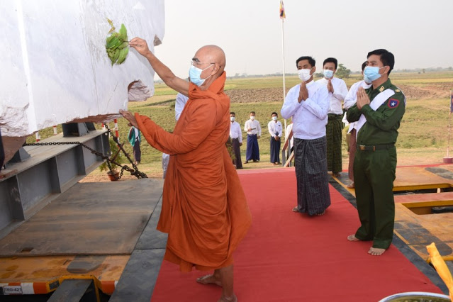 နေပြည်တော်တွင် တည်ထားကိုးကွယ်မည့် ဘူမိဖဿမုဒြာ ထိုင်တော်မူကျောက်ဆစ် ဗုဒ္ဓရုပ်ပွား တော်မြတ်ကြီး၏ ဆင်းတုတော်နှင့် ပလ္လင်တော် အစိတ်အပိုင်းများကို Modular Trailer ဖြင့် ဆီမီးခုံဆိပ်ကမ်းမှ တည်ထားကိုးကွယ်မည့် နေပြည်တော် ကောင်စီနယ်မြေသို့ ပဥ္စမအကြိမ် ပင့်ဆောင်ပူဇော်ခြင်း မဟာမင်္ဂလာကို ယနေ့နံနက်ပိုင်းတွင် မန္တလေးတိုင်းဒေသကြီး၊ မြင်းခြံ မြို့နယ်၊ ဆီမီးခုံကျေးရွာအနီး၌ ကျင်းပပြုလုပ်သည်။