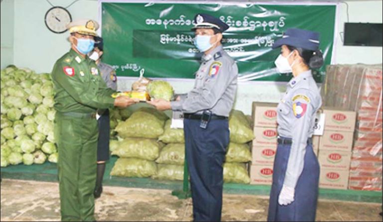 ထိုသို့ပေးအပ်လျက်ရှိရာ ယနေ့တွင် ဧရာဝတီတိုင်း ဒေသကြီးအတွင်းရှိ မြန်မာနိုင်ငံရဲတပ်ဖွဲ့ဝင်များနှင့် မိသားစုဝင်များအတွက် အနောက်တောင်တိုင်းစစ်ဌာနချုပ် တိုင်းမှူး ဗိုလ်ချုပ် အောင်အောင်နှင့်အဖွဲ့ ဝင်များကလည်းကောင်း၊ ပဲခူးတိုင်းဒေသကြီး အုတ်တွင်းမြို့၊ ကျောက်တံခါးမြို့၊ ဒိုက်ဦးမြို့၊ ကျောက်ကြီးမြို့၊ ရွှေကျင်မြို့၊ မင်းလှမြို့၊ လက်ပံတန်းမြို့၊ သာယာဝတီမြို့၊ ကြို့ပင်ကောက်မြို့၊ နတ်တလင်းမြို့၊ ဇီးကုန်းမြို့၊ အင်းမမြို့နှင့် ဝက်ထီးကန်မြို့ တို့ရှိ မြန်မာနိုင်ရဲတပ်ဖွဲ့ဝင်များနှင့် မိသားစုဝင်များအတွက် တောင်ပိုင်းတိုင်းစစ်ဌာနချုပ်မှ တာဝန်ရှိ သူများကလည်းကောင်း သွားရောက်တွေ့ဆုံ၍ ဆန်၊ ဆီ၊ ဆား၊ ပဲ အမယ်လေးမျိုးနှင့် စားသောက်ဖွယ်ရာများကို ပေးအပ်ကာ လိုအပ်သည်များ ညှိနှိုင်း ဆောင်ရွက်ပေးသည်။