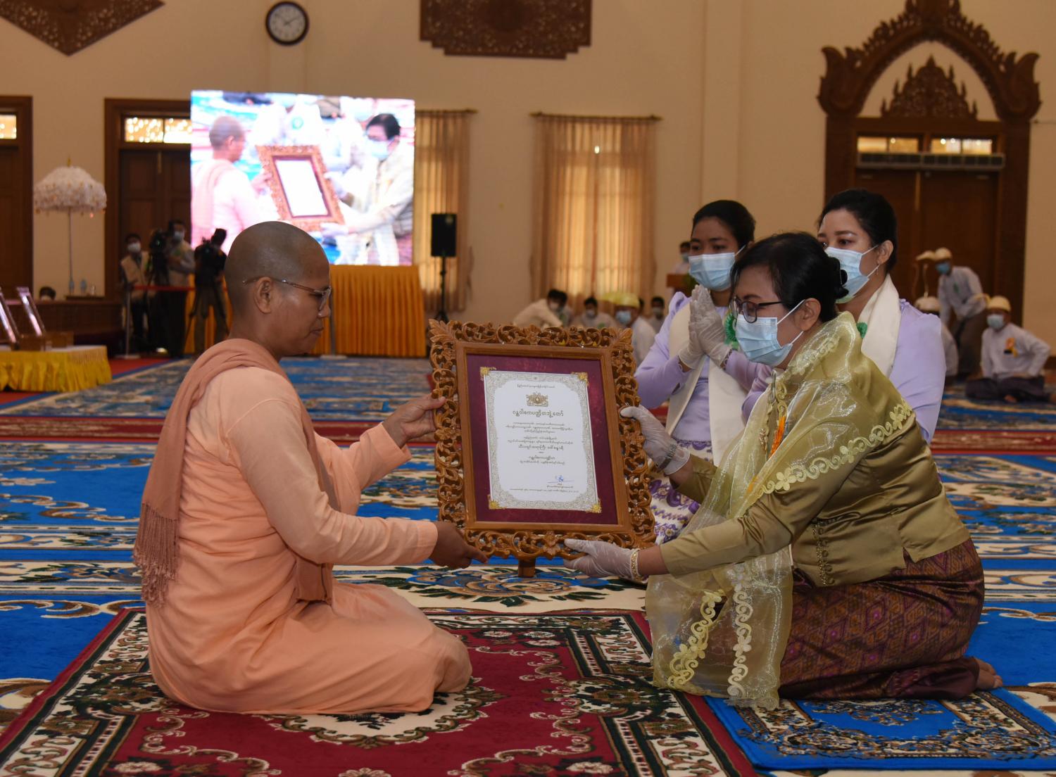 ယနေ့ကျင်းပသည့် နေပြည်တော်ကောင်စီနယ်မြေမှ ၂၀၂၁ ခုနှစ် သာသနာတော် ဆိုင်ရာ ဘွဲ့တံဆိပ်တော် ဆက်ကပ် ပူဇော်ပွဲ အခမ်းအနားတွင် အဂ္ဂမဟာပဏ္ဍိတ ဘွဲ့တံဆိပ် တော်ရ ဆရာတော် (၂)ပါး၊ အဂ္ဂမဟာသဒ္ဓမ္မဇောတိကဓဇ ဘွဲ့တံဆိပ်တော်ရ ဆရာတော် (၂)၊ အဂ္ဂမဟာ ဂန္ထဝါစကပဏ္ဍိတ ဘွဲ့တံဆိပ်တော်ရဆရာတော် (၃)ပါး၊ မဟာဂန္ထဝါစကပဏ္ဍိတ ဘွဲ့တံဆိပ် တော်ရဆရာတော် (၄)ပါး၊ မဟာသဒ္ဓမ္မဇောတိကဓဇ ဘွဲ့တံဆိပ်တော်ရ ဆရာတော် (၄)ပါး၊ မဟာကမ္မဋ္ဌာနာစရိယ ဘွဲ့တံဆိပ်တော်ရ ဆရာတော် (၁)ပါး၊ ဓမ္မကထိက ဗဟုဇနဟိတဓရ ဘွဲ့တံဆိပ်တော်ရ ဆရာတော် (၁) ပါး၊ ဂန္ထဝါစက ပဏ္ဍိတ ဘွဲ့တံဆိပ်တော်ရ ဆရာတော် (၇) ပါး၊ သဒ္ဓမ္မဇောတိကဓဇ ဘွဲ့တံဆိပ်တော်ရ ဆရာတော် (၅) ပါး၊ ဂန္ထဝါစက ပဏ္ဍိတ ဘွဲ့တံဆိပ်တော်ရ သီလရှင်ဆရာကြီး (၂) ပါးနှင့် မဟာသဒ္ဓမ္မဇောတိဥဓဇ ဘွဲ့တံဆိပ်တော်ရ လူပုဂ္ဂိုလ်(၂) ဦး တို့အား သာသနာတော်ဆိုင်ရာ ဘွဲ့တံဆိပ်များကို ဆက်ကပ်ပူဇော် ပေးအပ်ခဲ့ကြောင်း သိရသည်။