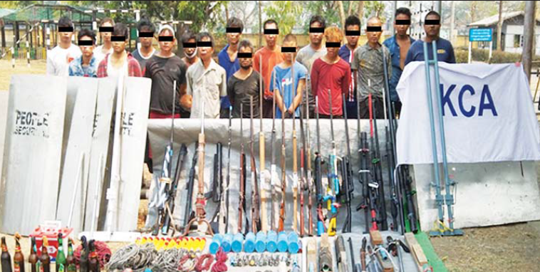 ထိုသို့ လူစုခွဲထိန်းသိမ်းစဉ် ဆူပူအကြမ်းဖက်သူများအနက် ရှေ့ဆုံးမှ ဦးဆောင်သူ အမျိုးသား ၁၈ ဦးကို ၎င်းတို့ ကိုင်ဆောင်အသုံးပြုလာသည့် 12 bore ကျည်ဖြင့် ပစ်ခတ်ရသော လုပ်သေနတ် ၄ လက်၊ လက်လုပ်သေနတ် ၁၁ လက်၊ ဂတ်စ်သေနတ် ၁၂ လက်၊ တူမီးသေနတ် ၄ လက်၊ လက်လုပ်ဗုံး ၅ လုံး၊ လက်လုပ်မိုင်း ၈ လုံး၊ 12 bore ကျည် ၄၁ တောင့်၊ မီးပုလင်း ၈ လုံး၊ ဝါယာကြိုး ၈ ခွေ၊ ဘထ္ထရီ ၁ လုံး၊ သတ္ထုဒိုင်း ၄ ခု၊ ဆူပူအကြမ်းဖက်ရာတွင် အသုံးပြုသည့် အခြားဆက်စပ်ပစ္စည်းများနှင့်အတူ ဖမ်းဆီး ထိန်းသိမ်းရမိခဲ့သည်။