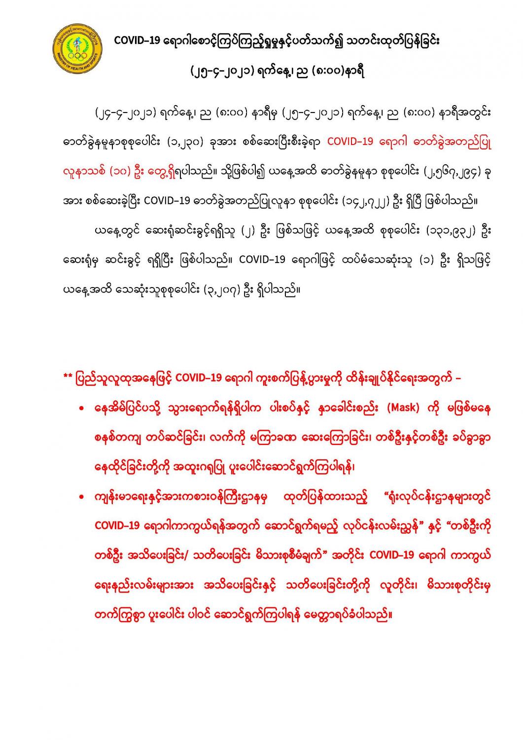 COVID-19 ရောဂါစောင့်ကြပ်ကြည့်ရှုမှုနှင့်ပတ်သက်၍ သတင်းထုတ်ပြန်ခြင်း (၂၅-၄-၂၀၂၁) ရက်နေ့၊ ည (၈:၀၀) နာရီ 04/25/2021 COVID-19 ရောဂါစောင့်ကြပ်ကြည့်ရှုမှုနှင့်ပတ်သက်၍ သတင်းထုတ်ပြန်ခြင်း (၂၅-၄-၂၀၂၁) ရက်နေ့၊ ည (၈:၀၀) နာရီ