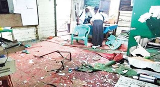 ထို့အတူ ယနေ့နံနက် ၅ နာရီ ၅၀ မိနစ်အချိန်တွင် ရန်ကုန်တိုင်းဒေသကြီး၊ လှိုင်သာယာ (အနောက်ပိုင်း)မြို့နယ်၊ အမှတ်(၁၆)ရပ်ကွက်၊ ရပ်ကွက်စီမံအုပ်ချုပ်ရေးရုံးအား အကြမ်းဖက်သူ အမျိုးသား (၂)ဦး မောင်းနှင်လာသည့် ဆိုင်ကယ် ၁ စီးမှ လက်လုပ်မိုင်း ၁ လုံးဖြင့် ပစ်ပေါက်ခဲ့၍ ပေါက်ကွဲမှုဖြစ်ပွားကြောင်း သတင်းအရ လုံခြုံရေးတပ်ဖွဲ့ဝင်များက သွားရောက် စစ်ဆေးခဲ့ရာ အဆိုပါလက်လုပ်မိုင်းမှာ ရုံးအပေါ်ထပ်သို့ ကျရောက်ပေါက်ကွဲခဲ့ပြီး ပေါက်ကွဲမှုကြောင့် ရုံးအပေါ်ထပ်တွင် နေသူ ဗဒင်(ခ) အောင်မြင့်မြတ် (၃၅)နှစ်(ဘ) ဦးကျော်ဝင်း တွင် ထိမှန်ဒဏ်ရာများ ရရှိခဲ့၍ မင်္ဂလာဒုံ၊ တပ်မတော်ဆေးရုံသို့ ပို့ဆောင်ထားရှိ ကြောင်း သိရသည်။