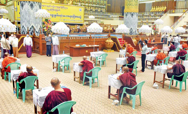 ရန်ကုန်တိုင်းဒေသကြီး စီမံအုပ်ချုပ်ရေးကောင်စီ ဥက္ကဋ္ဌ ဦးလှစိုးနှင့် ကောင်စီဝင်များသည် သာသနာ ရေးဦးစီးဌာနမှတာဝန်ရှိသူများနှင့်အတူယနေ့မွန်းလွဲ ၁၂ နာရီခွဲတွင် ရန်ကုန်မြို့ သီရိမင်္ဂလာ ကမ္ဘာအေး ကုန်းမြေ မဟာပါသာဏလိုဏ်ဂူသိမ်တော်ကြီး၌ တိပိဋကဓရ တိပိဋကကောဝိဒ ရွေးချယ်ရေးအဖွဲ့ ဩဝါဒါစရိယဆရာ တော်ကြီး ၁၀ ပါး၊ ကြီးကြပ်ရေး ဆရာတော်ကြီး လေးပါး၊ ပုစ္ဆကဆရာတော် လေးပါး နှင့် (၇၃)ကြိမ်မြောက် တိပိဋကဓရတိပိဋကကောဝိဒ ရွေးချယ်ရေး(သဘောရေး)စာမေးပွဲ ဖြေဆိုလျက် ရှိကြသော စာဖြေသံဃာ ၇၈ ပါးတို့အား ဖူးမြော် ကြည်ညို၍ လှူဖွယ်ဝတ္ထုများ ဆက်ကပ်လှူဒါန်းသည်။