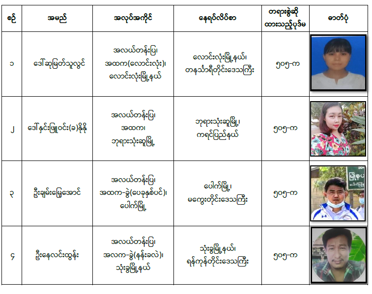 - အဆိုပါ အမှုဖွင့်လှစ်ထားသော ပညာရေးဝန်ထမ်းများအား ဖမ်းဆီးရမိရေး ဆောင်ရွက်လျက်ရှိပြီး ဖော်ပြပါပုဂ္ဂိုလ်များနှင့်စပ်လျဉ်း၍ နီးစပ်ရာရဲစခန်းများသို့ သတင်း ပေးပို့ရန်နှင့် လက်ခံထားရှိသူများကိုလည်း တရားဥပဒေအရ အရေးယူဆောင်ရွက် သွားမည်ဖြစ်ကြောင်း အသိပေးကြေညာအပ်ပါသည်။