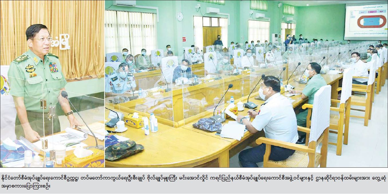 တင်ပြချက်နှင့်စပ်လျဉ်း၍ နိုင်ငံတော် စီမံအုပ်ချုပ်ရေးကောင်စီဥက္ကဋ္ဌ တပ်မတော် ကာကွယ်ရေး ဦးစီးချုပ်က လမ်းများတိုးချဲ့ဆောင်ရွက်ရာတွင် သတ်မှတ်ချက်များနှင့် ကိုက်ညီသည့် လမ်းအကျယ်အဝန်းများ ရှိရန်လိုကြောင်း၊ မော်တော်ဆိုင်ကယ် စီးနင်းမှု များပြားသည့်အတွက် မော်တော်ဆိုင်ကယ်စီးနင်းသူများ အန္တရာယ်ကင်းရှင်းစွာ မောင်းနှင်နိုင်ရေးအတွက်လည်း ဆိုင်ကယ်မောင်းနှင်း နိုင်သောလမ်းများ ထည့်သွင်း စဉ်းစားဆောင်ရွက်ရန်လိုကြောင်း၊ လမ်းများရေရှည် ကောင်းမွန်စေရေးအတွက် ရေစီရေလာ ကောင်းမွန်ရေးနှင့် လမ်းတစ်လျှောက် အရိပ်ရ လေကာပင်များစိုက်ပျိုးရန် လိုကြောင်း၊ အရေးပေါ်ကာလအတွင်း ဆူပူဆန္ဒပြမှုများအား အရေးယူဆောင်ရွက် နေမှုနှင့်ပတ်သက်၍ ဒီမိုကရေစီစနစ်တွင် ဆန္ဒပြမှုများရှိမည်ဖြစ်ကြောင်း၊ သို့သော် ပြဿနာအားပိုမိုကြီးထွားစေရန် သတင်းမှားများဖြင့် လှုံ့ဆော်မှုများ ဆောင်ရွက် နေသူများနှင့် အန္တရာယ်ရှိအောင် ဆောင်ရွက်နေသူများကိုသာ အရေးယူဆောင်ရွက် နေခြင်းဖြစ်ကြောင်း၊ နိုင်ငံသားစိစစ်ရေးကတ်ပြား မရရှိသေးသည့် နိုင်ငံသားများအား ပန်းခင်းစီမံချက်ဖြင့် ဆောင်ရွက်နေမှုနှင့်ပတ်သက်၍ ပြီးခဲ့သည့် ၂၀၂၀ ပြည့်နှစ် အထွေထွေရွေးကောက်ပွဲ မဲစာရင်းများမှားယွင်းမှုများဖြစ်ပေါ်မှုကြောင့် စိစစ်ခဲ့ချိန်၌ ကရင်ပြည်နယ်တွင် နိုင်ငံသားစိစစ်ရေးကတ်မရှိဘဲ ဆန္ဒမဲပေးခဲ့သူ ၂၃၉၀၀၀ ကျော် ပါဝင်ခဲ့သည့်ကို စိစစ်တွေ့ရှိခဲ့ရကြောင်း၊ ထို့ကြောင့် သတ်မှတ်ကာလအတွင်း နိုင်ငံသား များမှတ်ပုံတင်ရရှိရေးအတွက် ဆောင်ရွက်လျက်ရှိကြောင်း၊ နိုင်ငံသားစိစစ်ရေးကတ် ရခွင့်ရှိသည့် တိုင်းရင်းသားအားလုံးနှင့် ၁၉၈၂ ခုနှစ် နိုင်ငံသားဥပဒေနှင့်အကျုံးဝင် သူများအားလုံး နိုင်ငံသားစိစစ်ရေးကတ်ရရှိအောင် ဆောင်ရွက်ပေးမည်ဖြစ်ကြောင်း၊ မိမိတို့ တာဝန်ယူချိန်ကာလအတွင်း ရှေ့လုပ်ငန်းစဉ် (၅) ရပ်ချမှတ်၍ ဆောင်ရွက်လျက်ရှိပြီး လွတ်လပ်၍ မျှတမှုရှိသည့် ရွေးကောက်ပွဲ ပြန်လည်ကျင်းပနိုင်ရေး ကြိုပမ်း ဆောင်ရွက် လျက်ရှိကြောင်း၊ ဆန္ဒမဲများပေးသည့်အချိန်တွင် နိုင်ငံသားတိုင်း နိုင်ငံသား စိစစ်ရေးကတ်များ ရှိရန်ဆောင်ရွက်လျက်ရှိကြောင်း ရှင်းလင်းပြောကြားသည်။ ယင်းနောက် နိုင်ငံတော်စီမံအုပ်ချုပ်ရေးကောင်စီဥက္ကဋ္ဌ တပ်မတော်ကာကွယ်ရေး ဦးစီးချုပ်က အမှာစကားပြောကြားရာတွင် မိမိတို့နိုင်ငံ၏ အားကစားကဏ္ဍသည် ရှေးယခင်က ထိပ်တန်းအဆင့်တွင်ရှိခဲ့သော်လည်း ယခုနောက်ပိုင်းတွင် အာဆီယံ အဆင့်၌ပင် နိမ့်ကျ လျက်ရှိကြောင်း၊ အားကစားသည် ချက်ချင်းဆောင်ရွက်၍မရဘဲ အချိန်ယူ၍ ဆောင်ရွက်ရ ကြောင်း၊ အားကစားမြှင့်တင်ရေးလုပ်ငန်းများ ဆောင်ရွက်ရာတွင် အားကစား
