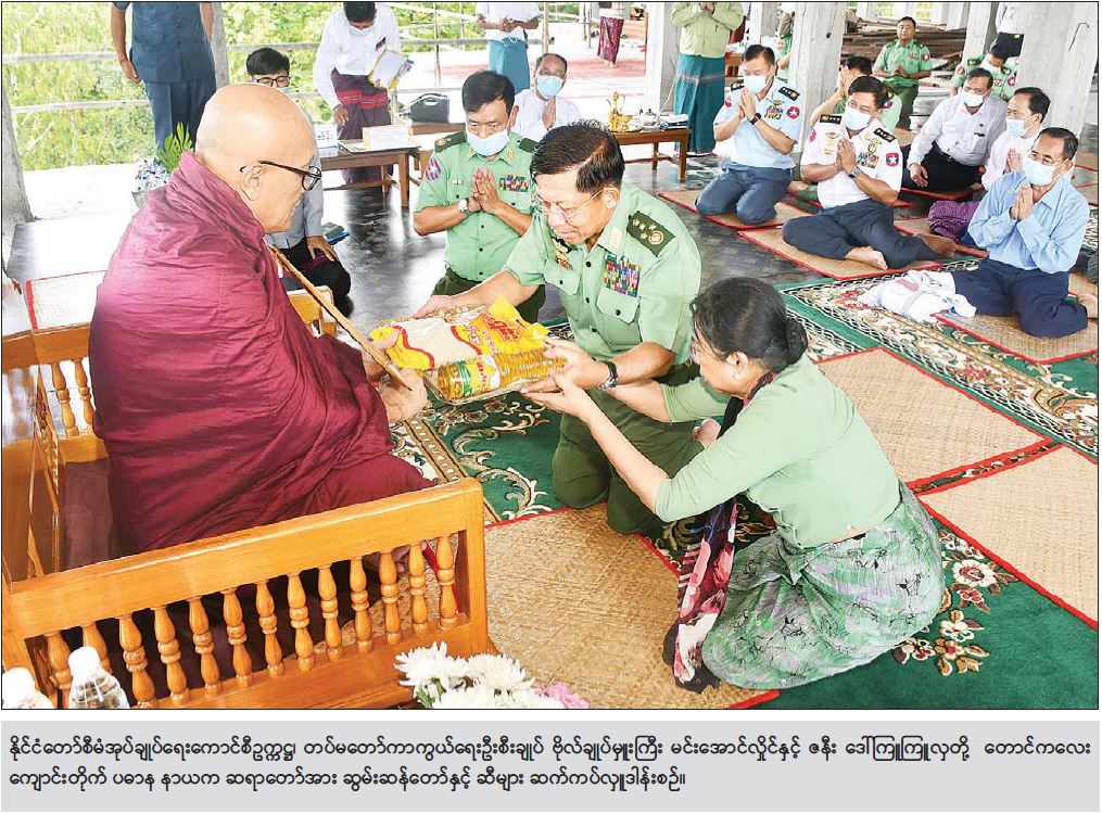 ထို့နောက် နိုင်ငံတော်စီမံအုပ်ချုပ်ရေးကောင်စီဥက္ကဋ္ဌ တပ်မတော်ကာကွယ်ရေး ဦးစီးချုပ်သည် ဇနီးဒေါ်ကြူကြူလှနှင့် အဖွဲ့ဝင်များလိုက်ပါ၍ ဘားအံမြို့ပေါ်ရှိ ထေကြီးဝါကြီး ဆရာတော်ကြီး များဖြစ်သည့် ဇွဲကပင်ကျောင်းဆရာတော် ဘဒ္ဒန္တကဝိဓဇ၊ လမင်းပရိယတ္တိ စာသင်တိုက် ဆရာတော် ဘဒ္ဒန္တကေသရိန္ဒ၊ မဲဘောင်ကျောင်းဆရာတော် ဘဒ္ဒန္တဝိမလတို့အား မဲဘောင်ကျောင်းတိုက်တွင်လည်းကောင်း၊ နိုင်ငံတော် သံဃမဟာနာယကအဖွဲ့ အဖွဲ့ဝင် ဆရာတော် ဘားအံမြို့၊ မိုးကယ်ကျောင်းတိုက် ဆရာတော် အဂ္ဂမဟာဂန္ထဝါစက ပဏ္ဍိတဘဒ္ဒန္တတေဇိန္ဒ အားလည်းကောင်း၊ ကော့ထော်ကျေးရွာအုပ်စု၊ တောင်ကလေးကျေးရွာ၊ တောင်ကလေးကျောင်းတိုက် ပဓာန နာယကဆရာတော် ဘဒ္ဒန္တ ပညာသာမိအားလည်းကောင်း အသီးသီးသွား ရောက် ဖူးမြော်ကြည်ညိုကြပြီး သာသနာရေးဆိုင်ရာများလျှောက်ထားတင်ပြ၍ နဝကမ္မအလှူတော်ငွေများနှင့် လှူဖွယ်ပစ္စည်းများ၊ တပ်မတော်(ကြည်း၊ရေ၊လေ) မိသားစုများက လှူဒါန်းသည့် ဆွမ်းဆန်တော်နှင့် ဆီများအား အသီးသီးဆက်ကပ် လှူဒါန်းခဲ့ကြသည်။