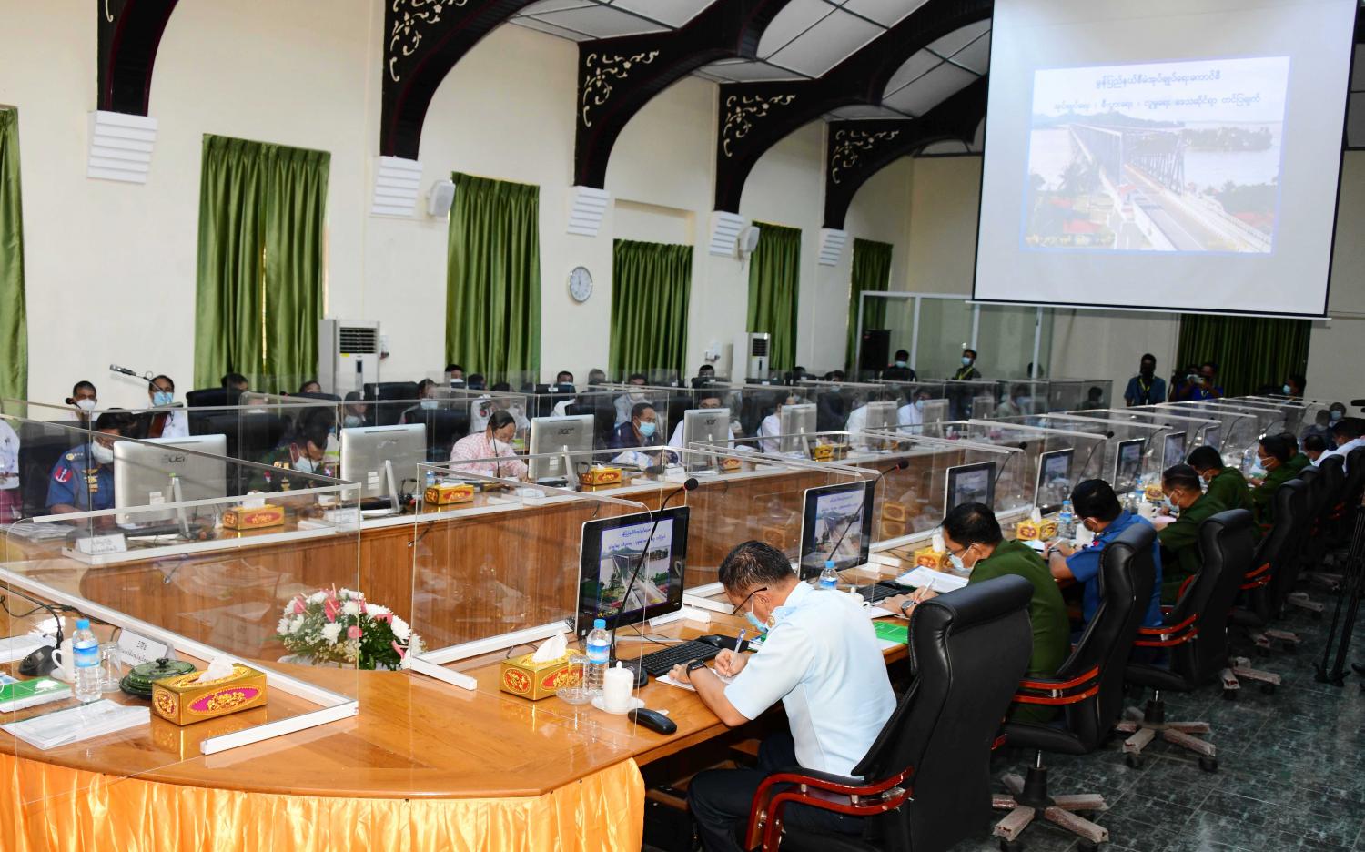 ဦးစွာ အစည်းအဝေးခန်းမတွင် ပြည်နယ်စီမံအုပ်ချုပ်ရေးကောင်စီ ဥက္ကဋ္ဌ ဦးဇော်လင်းထွန်းက ပြည်နယ်အတွင်း လူမှုရေး၊ စီးပွားရေး၊ ကျန်းမာရေးနှင့် ဒေသဖွံဖြိုး တိုးတက်ရေးဆောင်ရွက်နေမှု အခြေအနေများ၊ COVID -19 ရောဂါကာကွယ်ဆေး ထိုးနှံ ဆောင်ရွက်ထားရှိမှု အခြေအနေများနှင့် အထွေထွေ အချက်အလက်များကို လည်းကောင်း၊ ပို့ဆောင်ရေးနှင့်ဆက်သွယ်ရေးဝန်ကြီးဌာန ပြည်ထောင်စုဝန်ကြီး ဗိုလ်ချုပ်ကြီး တင်အောင်စန်းက မော်လမြိုင်ဆိပ်ကမ်းဖွံ့ဖြိုးတိုးတက်ရေးအတွက် ဆောင်ရွက်သင့်သည့် အစီအမံများနှင့် မော်လမြိုင်လေဆိပ် အဆင့်မြှင့်တင်ရေးဆိုင်ရာ ကိစ္စရပ်များကို လည်းကောင်း ရှင်းလင်းတင်ပြသည်။
