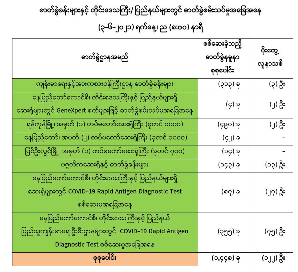 (၂-၆-၂၀၂၁) ရက်နေ့၊ ည (၈:၀၀) နာရီမှ (၃-၆-၂၀၂၁) ရက်နေ့၊ ည (၈:၀၀) နာရီအတွင်း ဓာတ်ခွဲနမူနာစုစုပေါင်း (၁,၄၄၈) ခုအား စစ်ဆေးပြီးစီးခဲ့ရာ COVID-19 ရောဂါ ဓာတ်ခွဲအတည်ပြု လူနာသစ် (၁၂၂) ဦး တွေ့ရှိရပါသည်။ သို့ဖြစ်ပါ၍ ယနေ့အထိ ဓာတ်ခွဲနမူနာ စုစုပေါင်း (၂,၆၂၆,၄၆၈) ခုအား စစ်ဆေးခဲ့ပြီး COVID-19 ဓာတ်ခွဲအတည်ပြုလူနာ စုစုပေါင်း (၁၄၃,၉၄၅) ဦး ရှိပြီ ဖြစ်ပါသည်။