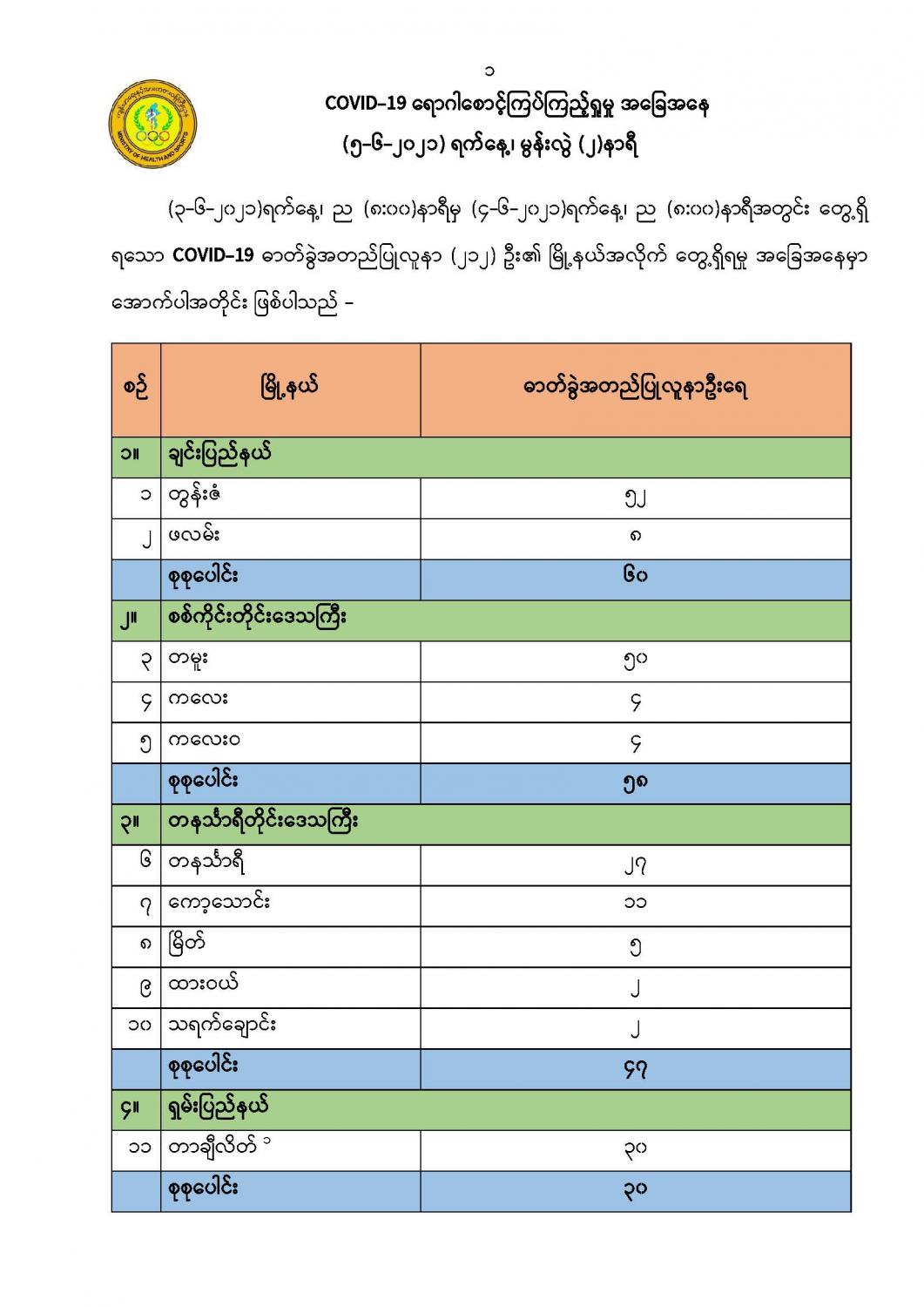 COVID – 19 ရောဂါစောင့်ကြပ်ကြည့်ရှု့မှုအခြေအနေ ( ၅-၆-၂၀၂၁) ၊ မွန်းလွဲ (၂) နာရီထုတ်ပြန်ချက်