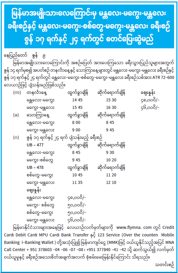 မြန်မာအမျိုးသားလေကြောင်းမှ မန္တလေး-မကွေး-မန္တလေး ခရီးစဉ်နှင့် မန္တလေး-မကွေး-စစ်တွေ-မကွေး-မန္တလေး ခရီးစဉ် ဇွန် ၁၇ ရက်နှင့် ၂၄ ရက်တွင် စတင်ပြေးဆွဲမည် 06/10/2021