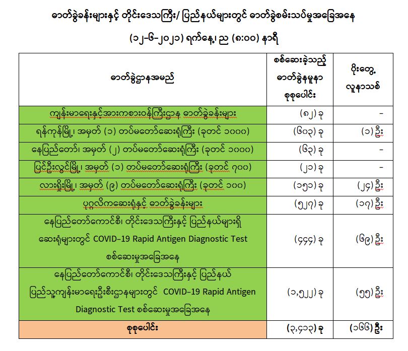 သို့ဖြစ်ပါ၍ ယနေ့အထိ ဓာတ်ခွဲနမူနာ စုစုပေါင်း (၂,၆၄၅,၃၃၂) ခု အား စစ်ဆေးခဲ့ပြီး COVID-19 ဓာတ်ခွဲအတည်ပြုလူနာ စုစုပေါင်း (၁၄၅,၂၃၀) ဦး ရှိပြီ ဖြစ်ပါသည်။