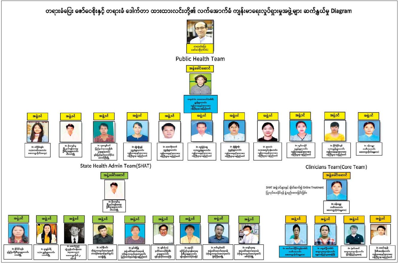 SHAT အဖွဲ့၏ အောက်တွင်လက်တွေ့အကောင်အထည်ဖော်ရန် မြို့နယ် အဆင့် Township Health Admin Team (THAT)များကို ဆက်လက်ဖွဲ့စည်း လျက်ရှိကြောင်း ၊ SHAT အဖွဲ့နှင့် THAT အဖွဲ့များ အကြား Online ဖြင့် ချိတ်ဆက် လှုပ်ရှားပေးရန်အတွက် Clinicians Team အား ဒေါက်တာ စန်းသန္တာ အပါအဝင် ၅ ဦးဖြင့် အောက်ပါအတိုင်းဖွဲ့စည်းထားကြောင်း သိရှိရသည်-