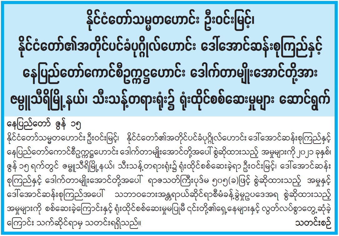 နိုင်ငံတော်သမ္မတဟောင်း ဦးဝင်းမြင့်၊ နိုင်ငံတော်၏အတိုင်ပင်ခံပုဂ္ဂိုလ်ဟောင်း ဒေါ်အောင်ဆန်းစုကြည်နှင့် နေပြည်တော်ကောင်စီဥက္ကဋ္ဌဟောင်း ဒေါက်တာမျိုးအောင်တို့အား ဇမ္ဗူသီရိမြို့နယ်၊ သီးသန့်တရားရုံး၌ ရုံးထိုင်စစ်ဆေးမှုများ ဆောင်ရွက် 06/16/2021