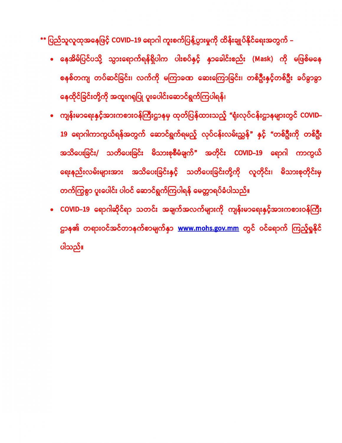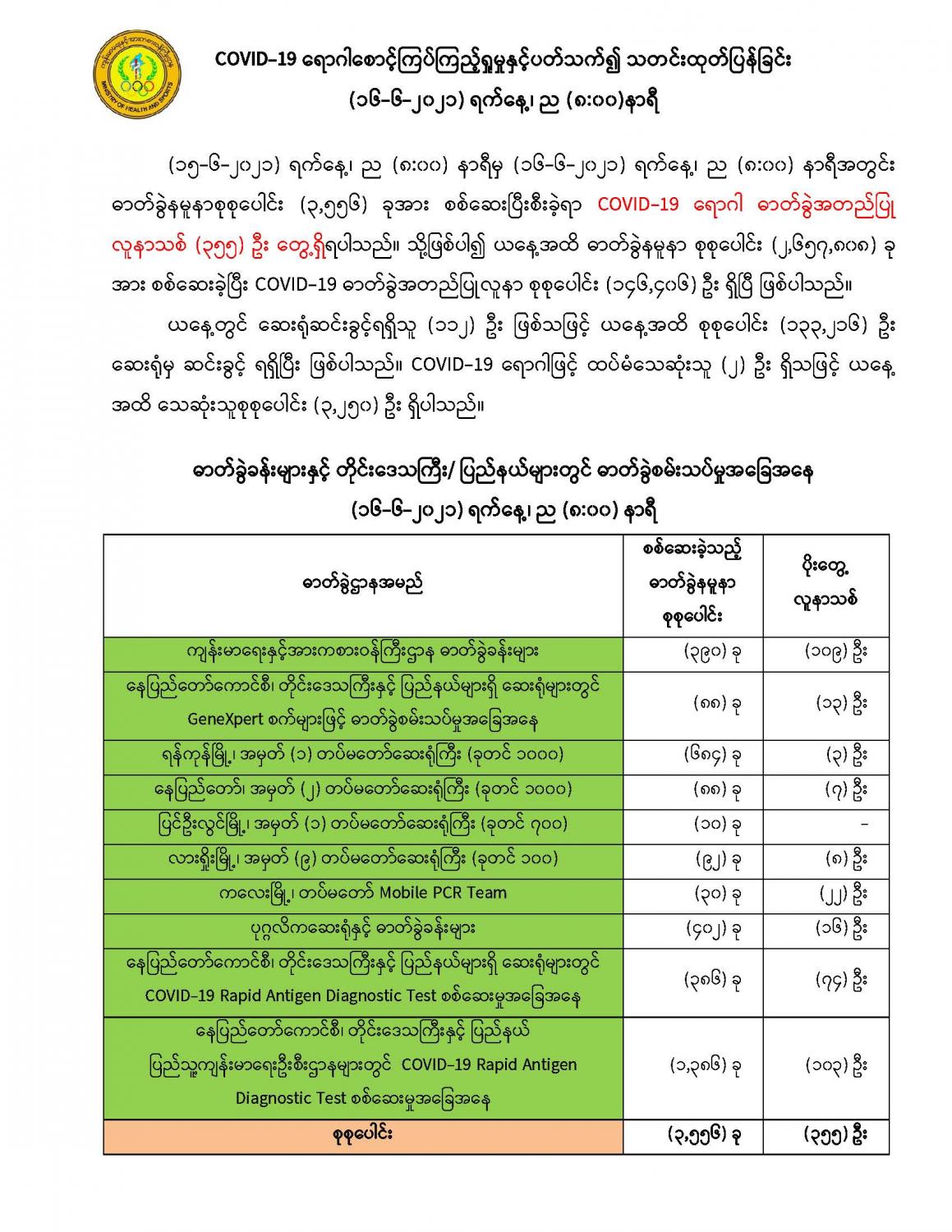 COVID-19 ရောဂါစောင့်ကြပ်ကြည့်ရှုမှုနှင့်ပတ်သက်၍ သတင်းထုတ်ပြန်ခြင်း (၁၆-၆-၂၀၂၁) ရက်နေ့၊ ည (၈:၀၀)နာရီ