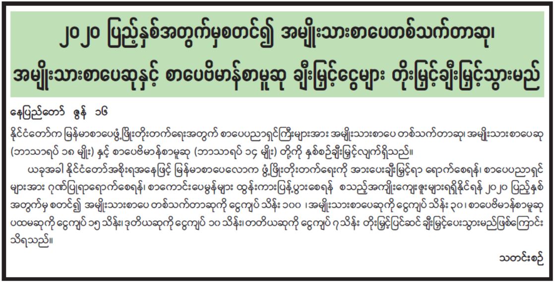၂၀၂၀ ပြည့်နှစ် အတွက်မှစတင်၍ အမျိုးသားစာပေတစ်သက်တာဆု၊ အမျိုးသားစာပေဆုနှင့် စာပေဗိမာန်စာမူဆု ချီးမြှင့်ငွေများ တိုးမြှင့်ချီးမြှင့်သွားမည် 06/17/2021