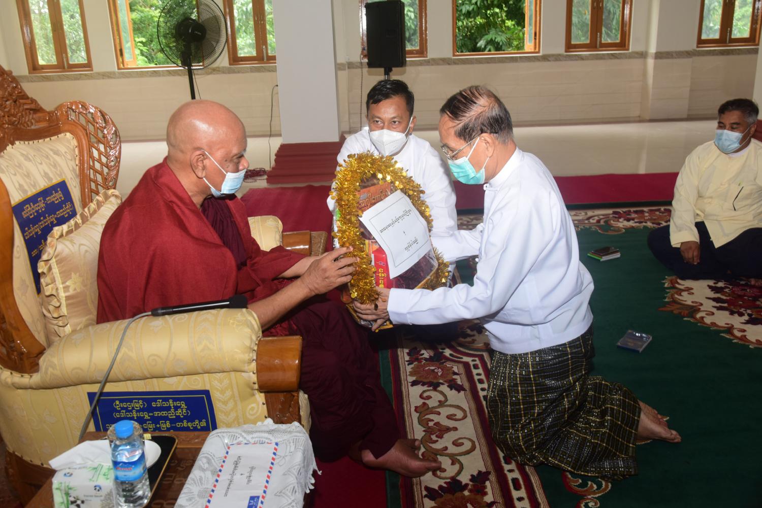 ထို့နောက် ပြည်ထောင်စုဝန်ကြီးနှင့်အဖွဲ့သည် မွန်းလွဲပိုင်းတွင် ရန်ကုန်တိုင်းဒေသကြီး၊ သန်လျင်မြို့နယ်၊ မင်းကျောင်းပထမပြန်စာသင်တိုက်ပဓာနနာယက၊ နိုင်ငံတော်သံဃ မဟာ နာယကအဖွဲ့၊ အကျိုးတော်ဆောင် အဂ္ဂမဟာပဏ္ဍိတ၊ အဂ္ဂမဟာသဒ္ဓမ္မဇောတိကဓဇ ဒေါက်တာဘဒ္ဒန္တစန္ဒိမာဘိဝံသအား သွားရောက်ဖူးမြော်ကြည်ညိုပြီး ဆရာတော်ကြီးထံ မှ သြဝါဒခံယူကာ လှူဖွယ်ဝတ္ထုပစ္စည်းများ ဆက်ကပ်လှူဒါန်းသည်။