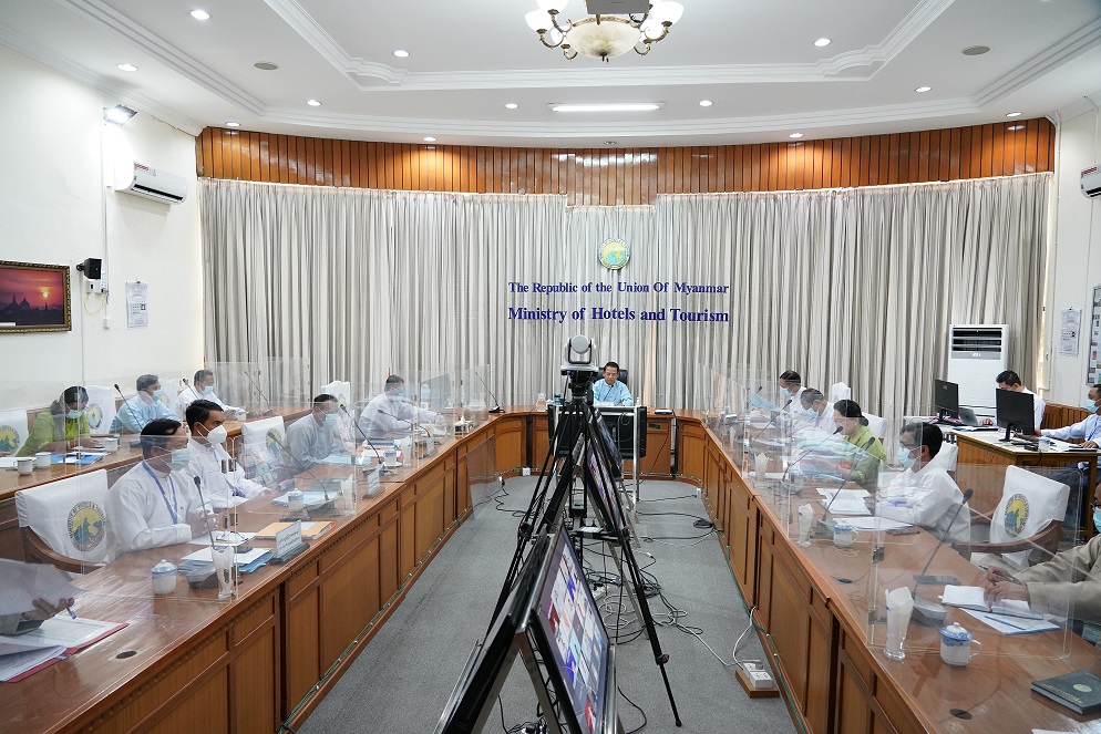 ယခုအခါတွင် နိုင်ငံအများ၌ COVID-19 Third wave ပြန်လည်ဖြစ်ပေါ်နေသဖြင့် တိုင်းဒေသကြီး/ ပြည်နယ်များတွင် ဖွင့်လှစ်ဆောင်ရွက်လျက်ရှိသည့် ဟိုတယ်နှင့်ခရီးသွား ဆက်စပ်လုပ်ငန်းများ အားလုံးထိခိုက်မှုမရှိစေရေး ကျန်းမာရေးနှင့်အားကစားဝန်ကြီးဌာနမှ ထုတ်ပြန်ထားရှိသည့် ကိုဗစ်-၁၉ စည်းမျဉ်းစည်းကမ်းများနှင့်အညီ လုပ်ငန်းရှင်များကိုယ်တိုင် လိုက်နာ၍ တာဝန်ရှိသူများမှလည်း စိစစ်ဆောင်ရွက်ပေးရန် အထူးအလေးနက်ထား ပြောကြား လိုကြောင်း၊ ခရီးသွားလုပ်ငန်းများ စနစ်တကျ ပြန်လည်ဖွံ့ဖြိုးတိုးတက်စေရေးအတွက် ယနေ့ အစည်းအဝေးသို့ Online မှ တက်ရောက်လာကြသည့် ကိုယ်စားလှယ်များနှင့် ခရီးသွား ကော်မတီဝင်များမှ ဝိုင်းဝန်းအကြံပြု ဆွေးနွေးကြစေ လိုပါကြောင်း ပြောကြားသည်။
