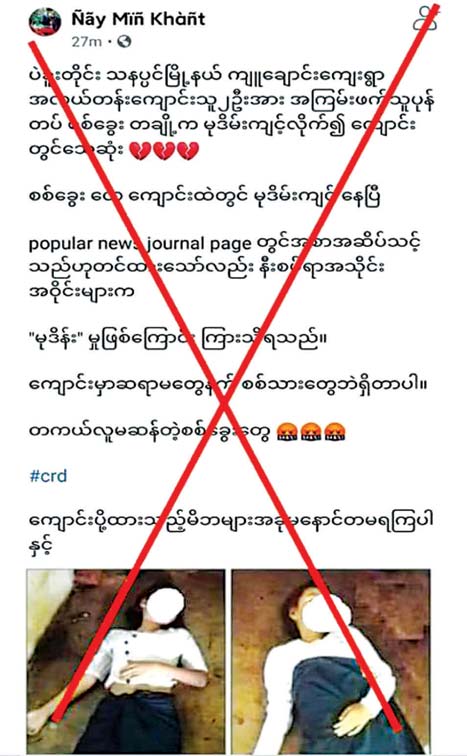 ဖြေ(၁) ။ ။ ပဲခူးတိုင်းဒေသကြီး၊ သနပ်ပင်မြို့နယ်၊ ကျူချောင်းကျေးရွာနေ အလယ်တန်း ကျောင်းသူ ၂ ဦး တပ်မတော်သားအချို့က မုဒိမ်းကျင့်လို့သေဆုံးတယ်ဆိုပြီး လူမှုကွန်ရက် စာမျက်နှာမှာ မဟုတ်တမ်းတရား ရေးသားနေတာတွေ့ ရှိပါတယ်။ ဒီသတင်းနဲ့ပတ်သက်လို့ လည်း သတင်းထုတ်ပြန်ထားပြီးဖြစ်ပါတယ်။ ဇွန်လ ၁၄ ရက်နေ့ နံနက် ၇ နာရီကျော်မှာ မစုမယ်ဆန်း (၁၂နှစ်) နဲ့ မသဇင်ခိုင် (၁၂နှစ်)တို့၂ ဦးဟာ စာသင်ခန်းအတွင်း တံမြက်စည်းလှည်း သန့်ရှင်းရေးလုပ်နေတဲ့အချိန်မှာလဲကျသွားတယ်။ လဲကျသွားတာကို ကျောင်းသား ၁ ဦးက မြင်ပြီးတော့ ကျောင်းအုပ်ဆရာမကြီးထံ သွားပြောတယ်။ ကျောင်းအုပ်ဆရာမကြီး သွားပြီး ကြည့်တဲ့အချိန်မှာ မသဇင်ခိုင်က စာသင်ခန်းအတွင်း စာရေးစားပွဲဘေးမှာ လဲကျနေပြီးတော့ မစုမယ်ဆန်းကတော့ နံရံမှီလျက်အနေအထားဖြင့် လဲကျနေတာကို တွေ့ရတယ်။ ထူးခြားတာက သူတို့ ၂ ဦး ပါးစပ်မှာ အမြှုပ် အနည်းငယ်ထွက်နေတာကို တွေ့ရတယ်။ ကျောင်းအုပ် ဆရာမကြီး နဲ့ သားဖွားဆရာမတို့က သနပ်ပင်မြို့၊ ပြည်သူ့ဆေးရုံကြီးကို ပို့ဆောင် ခဲ့ပေမယ့် နံနက် ၉ နာရီ မိနစ် ၂၀ မှာ အဲဒီကျောင်းသူ ၂ ဦးဟာ သေဆုံးသွားခဲ့ပါတယ်။