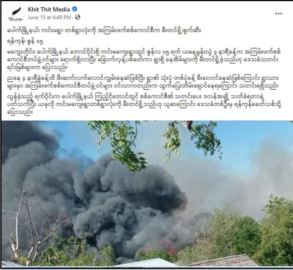 သတင်းမီဒီယာများအနက် လုပ်ငန်းလိုင်စင်ပိတ်သိမ်းခြင်းခံထားရသည့် ခေတ်သစ်မီဒီယာမှ ၎င်းဖြစ်စဉ် ကို ဇွန်လ ၁၅ ရက်နေ့ ညနေ ၄ နာရီ ၄၉ မိနစ် အချိန်၌ မီးလောင်မှုသတင်းကို Facebook Account လူမှုကွန်ယက်တွင် “ပေါက်မြို့နယ်၊ ကင်းမရွာ တစ်ရွာလုံးကို အကြမ်းဖက်စစ်ကောင်စီမှ မီးတင်ရှို့ ဖျက်ဆီး” ဟု ခေါင်းစဉ်ဖြင့် စတင်ရေးသားခဲ့ပြီး ၎င်းသတင်း၌ ညနေ ၄ နာရီခွဲခန့်ထိ ရွာ၏သုံးပုံတစ်ပုံ မီးလောင်နေဆဲဖြစ်ပြီး မီးဆက်လက်လောင်ကျွမ်းလျက်ရှိကြောင်း ထည့်သွင်းဖော်ပြခဲ့သည်ကို တွေ့ရှိရသည်။ လုံခြုံရေး တပ်ဖွဲ့ဝင်များအနေဖြင့် မီးလောင်မှုဖြစ်ပွားနေသည့် နေအိမ်များအား ဝိုင်းဝန်း ငြှိမ်းသတ်နေဆဲတွင် ၎င်း မီဒီယာအနေဖြင့် တစ်ရွာလုံး မီးကူးစက်လောင်ကျွမ်းမည်ကို ကြိုတင်သိရှိခဲ့ခြင်း၊ ၎င်းအချိန်၌ လုံခြုံရေးတပ်ဖွဲ့ဝင်များက မီးငြှိမ်းသတ်ရေးလုပ်ငန်းများကို စတင် ဆောင်ရွက်နေသော် လည်း ပါရှိလာသည့် လူအင်အားနှင့် လုံခြုံရေး အခြေအနေအရ အကန့်အသတ်ဖြင့်သာ မီးငြှိမ်းသတ်ခြင်းကို ဆောင်ရွက်နိုင်ခဲ့ပြီး လုံခြုံရေးတပ်ဖွဲ့ဝင်များ ရောက်ရှိခြင်းမရှိသေးသည့် ရွာအတွင်းရှိ နေအိမ်များကို PDF အကြမ်းဖက် အဖွဲ့များက မီးရှို့ဖျက်ဆီးရန်နှင့် မီးရှို့ဖျက်ဆီးမှုကြောင့် မီးလောင် ကျွမ်းမှုကို လုံခြုံရေးတပ်ဖွဲ့ဝင်များက မီးရှို့မှုကြောင့် မီးလောင်ကျွမ်းမှုအဖြစ် ကြိုတင်ရေးသားထားနိုင်ခြင်းကို ကြည့်ရှုခြင်းဖြင့် ၎င်းမီဒီယာနှင့် PDF အဖွဲ့များ အချိန်အခါကိုက် ဆောင်ရွက်ထားသည်ကို ပေါ်လွင်လျက်ရှိသည်။