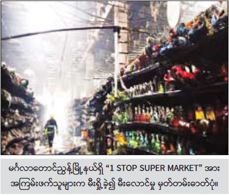 ရန်ကုန်တိုင်းဒေသကြီးအတွင်း မြို့နယ်အချို့ရှိ “1 STOP SUPER MARKET” ဆိုင် ၃ ဆိုင်အား အကြမ်းဖက်သူများက မီးရှို့ဖျက်ဆီး