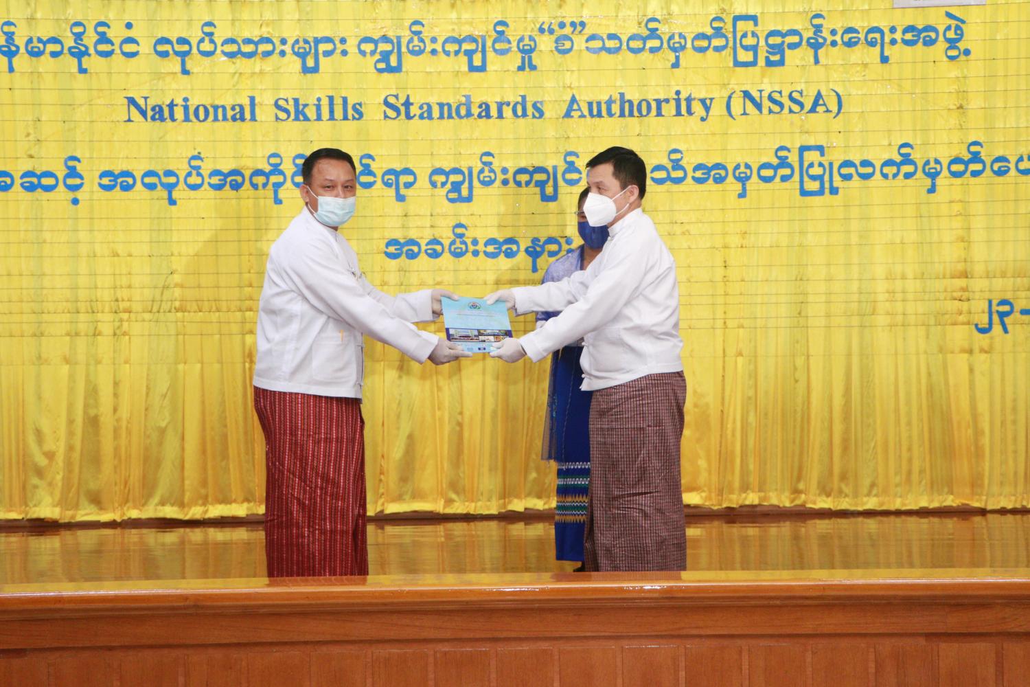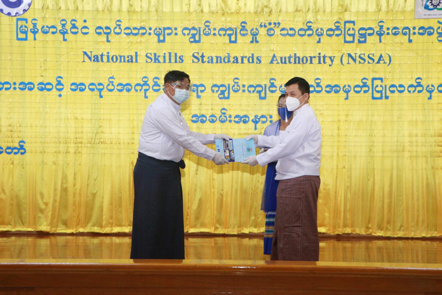 မြန်မာနိုင်ငံလုပ်သားများ ကျွမ်းကျင်မှု “စံ” သတ်မှတ်ပြဋ္ဌာန်းရေးအဖွဲ့ (National Skills Standard Authority-NSSA) ၏ အမျိုးသားအဆင့် အလုပ်အကိုင်ဆိုင်ရာကျွမ်းကျင်မှု အသိ အမှတ်ပြု လက်မှတ်ပေးအပ်ပွဲကို ယနေ့နံနက် ၁၀ နာရီက နေပြည်တော်ရှိ အလုပ်သမား၊ လူဝင်မှုကြီးကြပ်ရေး နှင့် ပြည်သူ့အင်အားဝန်ကြီးဌာန အစည်းအဝေးခန်းမ၌ ကျင်းပသည်။