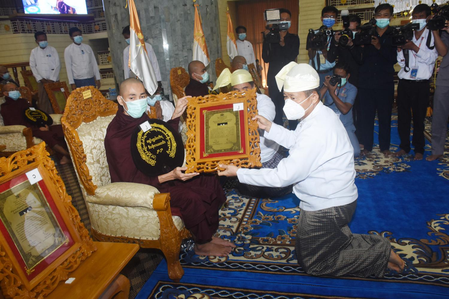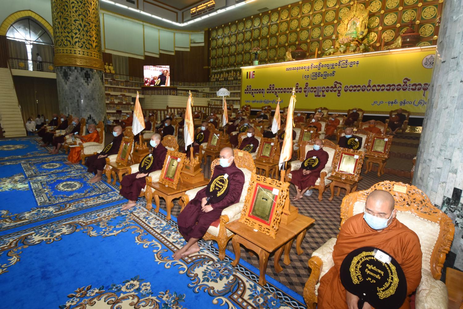 ထို့နောက် ဒီဃနိကာယ်သုံးကျမ်း သဘောရေးဖြေအောင် ဒီဃနိကာယကောဝိဒ ဘွဲ့တံ ဆိပ်တော်ရ စစ်ကိုင်းမြို့၊မင်းကွန်း တိပိဋကနိကာယကျောင်းမှ အရှင် အာနန္ဒပဏ္ဍိတာ လင်္ကာရ၊ ဝိနည်းဒုတိယပိုင်း သုံးကျမ်း သဘောရေးဖြေအောင် ဝိနယကောဝိဒ ဘွဲ့တံဆိပ်တော်ရ စစ်ကိုင်းမြို့၊ မင်းကွန်း တိပိဋကနိကာယကျောင်းမှ အရှင်မင်္ဂလာစာရ၊ ရန်ကုန် တိုင်းဒေသကြီး ဒဂုံမြို့သစ် (အရှေ့ပိုင်း)မြို့နယ်၊ တိပိဋကမဟာဂန္တဝင်နိကာယ်ကျောင်း မှ အရှင်နန္ဒိမာလင်္ကာရနှင့် အရှင် သုမင်္ဂလ၊ ဝိနည်းပထမပိုင်းနှစ်ကျမ်း သဘောရေးဖြေ အောင် ဥဘတောဝိဘင်္ဂကောဝိဒ ဘွဲ့တံဆိပ်တော်ရ စစ်ကိုင်းမြို့၊ မင်းကွန်း တိပိဋကနိ ကာယကျောင်းမှ အရှင်ဩဘာသ(ဝက်လက်)၊ အရှင်ပညာသိရီ(ဆီဆိုင်)၊ အရှင်မဏ္ဍလာလင်္ကာရ၊ ရန်ကုန်တိုင်းဒေသကြီး ဒဂုံမြို့သစ်(အရှေ့ပိုင်း)မြို့နယ်၊ တိပိဋကမဟာဂန္တဝင်နိကာယ် ကျောင်း မှ အရှင်စန္ဒိမာလင်္ကာရနှင့် အရှင်ပညာသာမီလင်္ကာရ တို့ထံ ကောင်စီဝင် ဦးမောင်းဟာ၊ ပြည်ထောင်စုဝန်ကြီးများ၊ ရန်ကုန်တိုင်းဒေသကြီးစီမံ အုပ်ချုပ်ရေးကောင်စီ ဥက္ကဋ္ဌ၊ ဒုတိယ ဗိုလ်ချုပ်ကြီး သက်ပုံ၊ ရန်ကုန်တိုင်းစစ်ဌာနချုပ် တိုင်းမှူးနှင့် တာဝန်ရှိသူများက ဘွဲ့တံဆိပ် တော်နှင့်အောင်လတ်မှတ်များဆက်ကပ်ကြသည်။