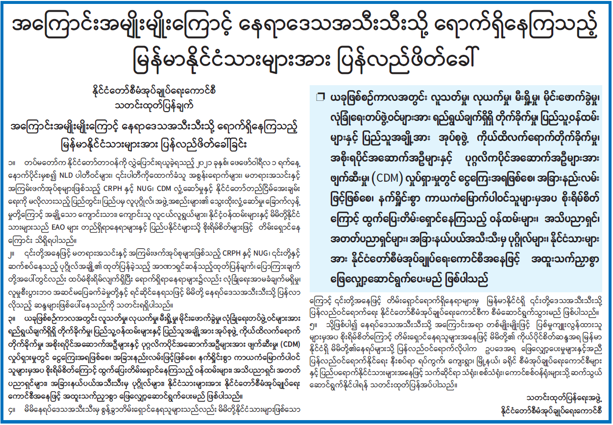 အကြောင်းအမျိုးမျိုးကြောင့် နေရာဒေသအသီးသီးသို့ ရောက်ရှိနေကြသည့် မြန်မာနိုင်ငံသားများအား ပြန်လည်ဖိတ်ခေါ် 06/29/2021