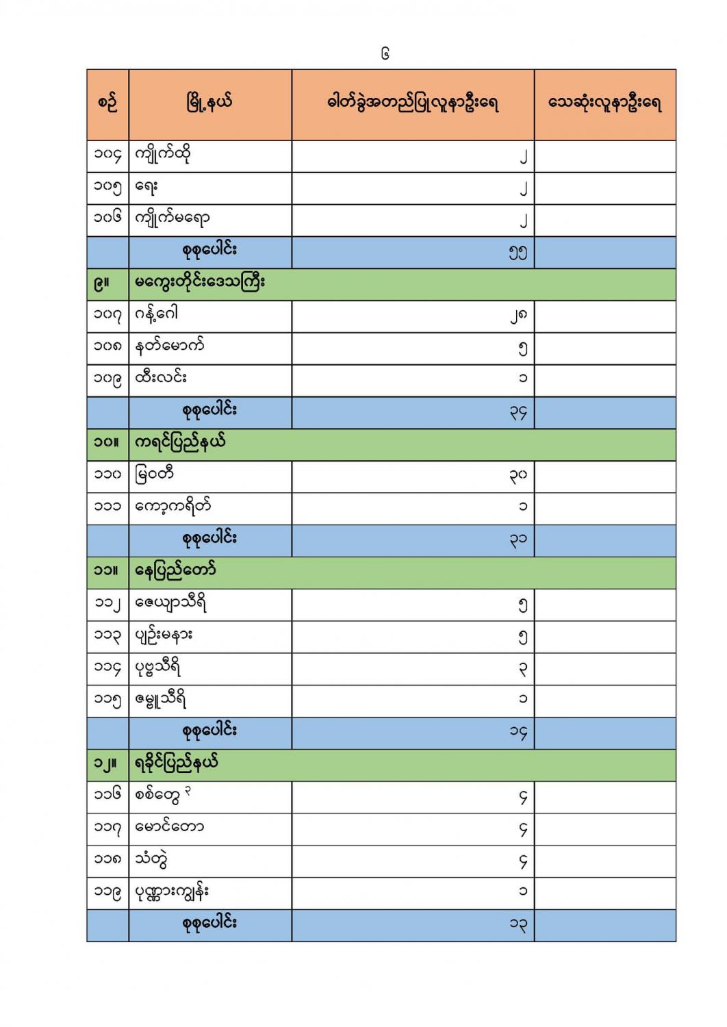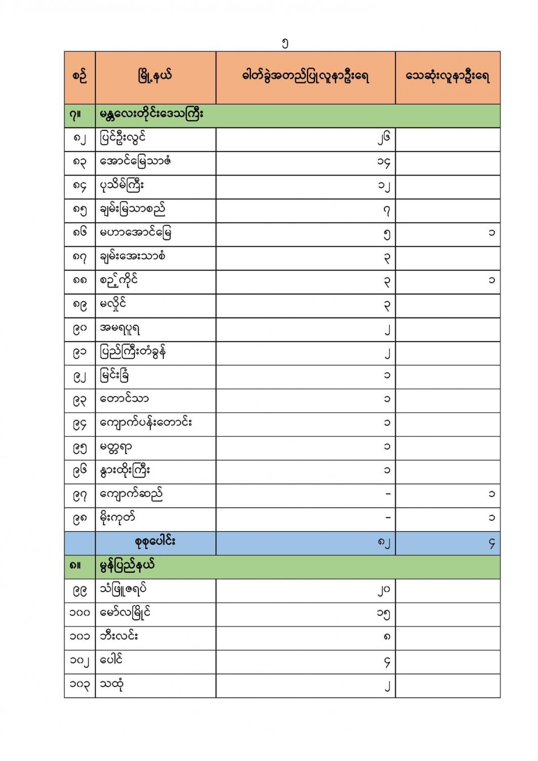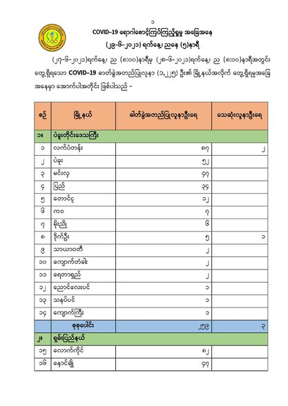 (၂၇-၆-၂၀၂၁)ရက်နေ့၊ ည (၈:၀၀)နာရီမှ (၂၈-၆-၂၀၂၁)ရက်နေ့၊ ည (၈:၀၀)နာရီအတွင်း တွေ့ရှိရသော COVID-19 ဓာတ်ခွဲအတည်ပြုလူနာ (၁,၂၂၅) ဦး၏ မြို့နယ်အလိုက် တွေ့ရှိရမှုအခြေ အနေမှာ အောက်ပါအတိုင်း ဖြစ်ပါသည်