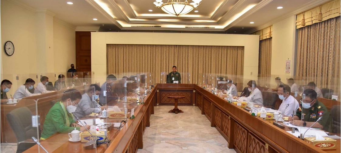 ယင်းနောက် ပြည်ထောင်စုဝန်ကြီးများနှင့် ကာကွယ်ရေးဦးစီးချုပ်ရုံး(ကြည်း) ဆေးဝန်ထမ်း ညွှန်ကြားရေးမှူး တို့က လက်ရှိ COVID-19 ရောဂါ စစ်ဆေးတွေ့ရှိမှု၊ ကုသပေးမှုနှင့် သေဆုံးမှု အခြေအနေ၊ အိမ်နီးချင်းနိုင်ငံများတွင် ကူးစက်ပြန့်ပွားနေမှုအခြေအနေ၊ ရောဂါစစ်ဆေးရာတွင် တွေ့ကြုံရသည့် အခက်အခဲများ၊ COVID-19 ရောဂါထိန်းချုပ်ရေးနှင့်စပ်လျဉ်း၍ ပြည်သူများ သိသင့်သိထိုက်သည်များ ထုတ်လွှင့်ပြန်ကြားပေးရေး၊ ရောဂါတွေ့ရှိမှုများပြားလာပါက လူနာ များထားရှိရန် Quarantine Center များ ကြိုတင်ပြင်ဆင်ထားရှိမည့်အခြေအနေ၊ တပ်မတော် အနေဖြင့် ရောဂါကုသထိန်းချုပ်ရေးလုပ်ငန်းများတွင် ကူညီဆောင်ရွက်ပေးနိုင်ရေး စုဖွဲ့ထားရှိမှုအခြေအနေ၊ ရောဂါတွေ့ရှိမှုများပြားလာပါက အောက်ဆီဂျင်ပြတ်လပ်မှု မရှိစေရေး ကြိုတင် ပြင်ဆင်ဆောင်ရွက် ထားရှိရေး၊ ကာကွယ်ထိန်းချုပ်ရေးလုပ်ငန်းများ အရှိန်အဟုန်မြှင့်တင် ဆောင်ရွက်သွားရေး၊ မြို့ဝင်မြို့ထွက်များတွင် စနစ်တကျစိစစ်ကြပ်မတ်ရေးနှင့် ရှောင်ကွင်းလမ်း များမှ ဝင်ရောက်မှုမရှိစေရေး ကြပ်မတ်ဆောင်ရွက်ရေး၊ စေတီပုထိုးများ၊ ဘုန်းတော်ကြီး ကျောင်းများ၊ သီလရှင်ကျောင်းများနှင့် ဘာသာရေးဆိုင်ရာ ကျောင်းများတွင် COVID-19 စည်းကမ်းများနှင့်အညီ လိုက်နာဆောင်ရွက်ရေး ညွှန်ကြားထားရှိမှု၊ COVID-19 ရောဂါဆိုင်ရာ အချက်အလက်များနှင့် ရောဂါကာကွယ်ရေးအတွက် နှိုးဆော်ချက်များအား အော်ပရေတာများမှ တစ်ဆင့် ပြည်သူများသိရှိစေရေး ဆောင်ရွက်လျက်ရှိမှု အခြေအနေများ၊ ပို့ဆောင်ရေးလုပ်ငန်းများ ဆောင်ရွက်လျက်ရှိသည့် ယဉ်မောင်းများနှင့် ဝန်ထမ်းများ ကာကွယ်ဆေးထိုးနှံနိုင်ရေးနှင့် ရောဂါစစ်ဆေးမှုများ ပြုလုပ်နိုင်ရေးဆောင်ရွက်ရန် လိုအပ်မှုအခြေအနေ၊ ရောဂါကူးစက်မှုခံရသည့် အလုပ်သမားများအား လူမှုဖူလုံရေး ထောက်ပံ့ငွေများပေးအပ်ခဲ့မှုနှင့် ဆေးဝါးကုသပေးမှု အခြေအနေ၊ တက္ကသိုလ်များတွင် ကျောင်းသား၊ ကျောင်းသူများ ရောဂါကူးစက်မှု အခြေအနေ၊ Stay at Home ပြုလုပ်ထားသည့် မြို့နယ်များရှိ အခြေခံပညာကျောင်းအချို့ ယာယီပိတ်ထားမှု အခြေအနေများနှင့် ပြန်လည်ဖွင့်လှစ်နိုင်ရေး ဆောင်ရွက်လျက်ရှိမှုအခြေအနေ၊ စာသင် ကျောင်းများတွင် ရောဂါကြိုတင်ကာကွယ်ရေး အထောက်အကူပြုပစ္စည်းများ ဖြန့်ဝေထားရှိမှု အခြေအနေ၊ COVID-19 ကာကွယ်ထိန်းချုပ်ရေးအတွက် အရှိန်အဟုန်မြှင့် ဆောင်ရွက်မည့် အခြေအနေ၊ Social Distancing ရှိစေရေး ဆောင်ရွက်သွားရမည့်အခြေအနေများနှင့် COVID-19 စည်းကမ်းချက်များ၊ SOP/ Guideline များအားလိုက်နာမှုရှိစေရေး စနစ်တကျကြပ်မတ် ဆောင်ရွက်ရန်လိုအပ်မှု၊ COVID-19 ကာကွယ်ရေးလုပ်ငန်းများတွင် ပါဝင်ကူညီဆောင်ရွက် လျက်ရှိသည့် စေတနာ့ဝန်ထမ်းများအား ကျန်းမာရေးဆိုင်ရာ သင်တန်းများ 