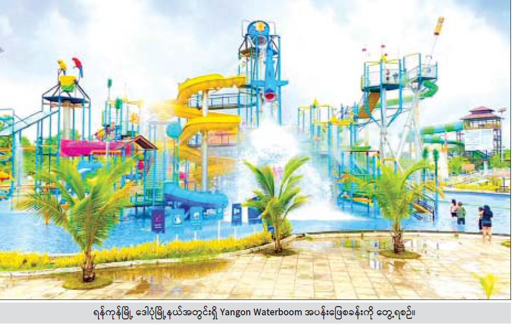 ပြန်လည်ဖွင့်ခွင့်ပြု “Yangon Waterboom ကို နိုင်ငံတော်က သတ်မှတ်ထားတဲ့ ကိုဗစ်-၁၉ ကပ်ရောဂါ ကာကွယ်ထိန်းချုပ်ရေး စည်းကမ်းချက်တွေနဲ့ အညီ ပြီးခဲ့တဲ့ရက်ပိုင်းကပဲ ပြန်လည်ဖွင့်လှစ်ခဲ့ပါတယ်။ အတိအကျပြောရရင် ပြီးခဲ့တဲ့ ဇွန်လနောက်ဆုံးပတ်မှာ စတင်ဖွင့်လှစ်ခဲ့တာပါ။ အခုလို ဖွင့်ဖြစ်တာကလည်း ဒီလုပ်ငန်းရေရှည်ပိတ်ထားရတာ အဆင်မပြေဖြစ်နေတော့ တိုင်းဒေသကြီးစီမံအုပ်ချုပ်ရေးကောင်စီကို ကျွန်တော်အနေနဲ့ ပြန်လည်ဖွင့်လှစ်ဖို့ စာတင်ခဲ့တယ်။ သက်ဆိုင်ရာ လူကြီးတွေကလည်း သူတို့ကိုယ်တိုင်လာကြည့်ပြီး နေ့စဉ်မဖွင့်နိုင်ရင်တောင် အဆင်သင့်တဲ့ ရက်လေးတွေကို ကိုဗစ်-၁၉ ကပ်ရောဂါ ကာကွယ်ထိန်းချုပ်ရေး စည်းကမ်းချက်တွေနဲ့အညီ ပြန်လည်ဖွင့်ခွင့်ပြုခဲ့လို့ အခုလို စနေ၊ တနင်္ဂနွေ နှစ်ရက်ကို ရွေးချယ်ကာ ဖွင့်လှစ်ပေးသွားဖို့ စီစဉ်ခဲ့တာပါ” ဟု Yangon Waterboom အပန်းဖြေစခန်း တာဝန်ရှိသူတစ်ဦးက ပြောကြားသည်။