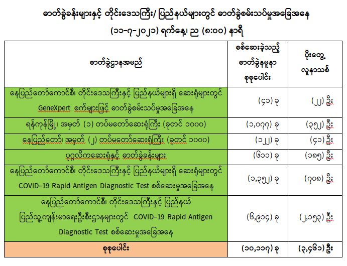 (၁၀-၇-၂၀၂၁) ရက်နေ့၊ ည (၈:၀၀) နာရီမှ (၁၁-၇-၂၀၂၁) ရက်နေ့၊ ည (၈:၀၀) နာရီအတွင်း ဓာတ်ခွဲနမူနာစုစုပေါင်း (၁၀,၁၁၇) ခုအား စစ်ဆေးပြီးစီးခဲ့ရာ COVID-19 ရောဂါ ဓာတ်ခွဲအတည်ပြု လူနာ သစ် (၃,၄၆၁) ဦး တွေ့ရှိရပါသည်။ သို့ဖြစ်ပါ၍ ယနေ့အထိ ဓာတ်ခွဲနမူနာ စုစုပေါင်း (၂,၈၆၆,၈၁၄) ခု အား စစ်ဆေးခဲ့ပြီး COVID-19 ဓာတ်ခွဲအတည်ပြုလူနာ စုစုပေါင်း (၁၉၂,၂၁၃) ဦး ရှိပြီ ဖြစ်ပါသည်။