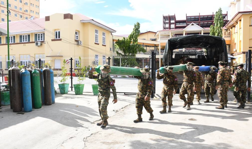 COVID-19 ရောဂါဓာတ်ခွဲအတည်ပြုပိုးတွေ့လူနာများကို ကုသရေးလုပ်ငန်း များ ဆောင်ရွက်ရာ တွင် အောက်ဆီဂျင်လိုအပ်ချက်များကို တစ်ဖက်တစ်လမ်းမှ အထောက်အကူပြုစေရန်အတွက် တပ်မတော်အနေဖြင့် အောက်ဆီဂျင်အိုးများကို ဆေးရုံများနှင့် COVID-19 ရောဂါကုသရေး ဌာနများ အရောက် သွားရောက်လှူ ဒါန်းလျက်ရှိသည်။