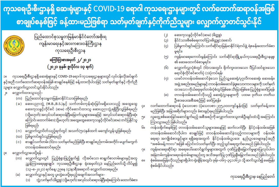 ကုသရေးဦးစီးဌာန ဆေးရုံများနှင့် COVID-19 ရောဂါ ကုသရေးဌာနများတွင် လက်ထောက်ဆရာဝန်အဖြစ် စာချုပ်စနစ်ဖြင့် ခန့်ထားမည်ဖြစ်ရာ သတ်မှတ်ချက်နှင့်ကိုက်ညီသူများ လျှောက်လွှာတင်သွင်းနိုင် 07/14/2021