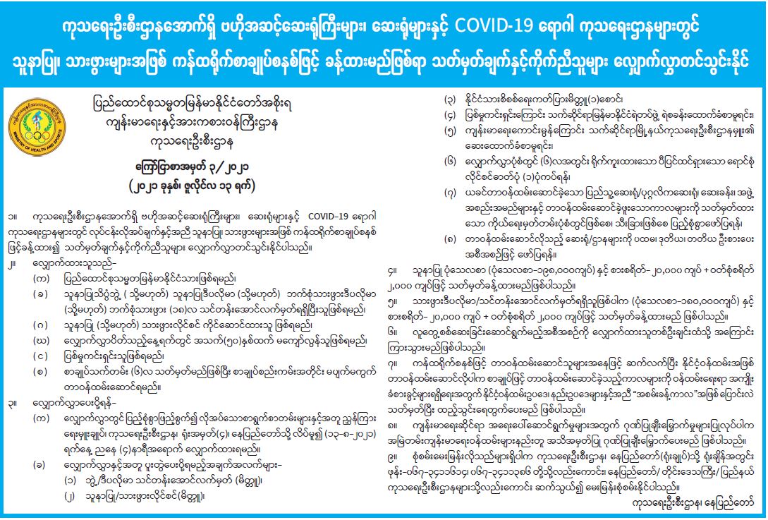 ကုသရေးဦးစီးဌာနအောက်ရှိ ဗဟိုအဆင့်ဆေးရုံကြီးများ၊ ဆေးရုံများနှင့် COVID-19 ရောဂါ ကုသရေးဌာနတွင် သူနာပြု ၊ သားဖွားများအဖြစ် ကန်ထရိုက်စာချုပ်စနစ်ဖြင့် ခန့်ထားမည်ဖြစ်ရာ သတ်မှတ်ချက်နှင့်ကိုက်ညီသူများ လျှောက်လွှာတင်သွင်းနိုင်