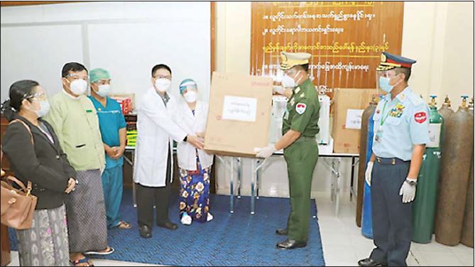 ကိုဗစ်-၁၉ ရောဂါဓာတ်ခွဲအတည်ပြု ပိုးတွေ့ လူနာ များနှင့် သီးသန့်စောင့်ကြည့်ရမည့်သူများကို ကုသရေးလုပ်ငန်းများ ဆောင်ရွက်ရာတွင် အောက်ဆီဂျင် လိုအပ်ချက်များကို တစ်ဖက် တစ်လမ်းမှ အထောက်အကူပြုစေရန်အတွက် တပ်မတော်နှင့် အလှူရှင်များက အောက်ဆီဂျင် အိုးများကို တိုင်းဒေသကြီးနှင့် ပြည်နယ်အသီးသီးရှိ ပြည်သူ့ဆေးရုံများ၊ တပ်မတော်ဆေးရုံများ၊ ကျန်းမာရေးဌာနများနှင့် ကိုဗစ်စင်တာများသို့ ပေးပို့လှူဒါန်းလျက်ရှိသည်။ ။