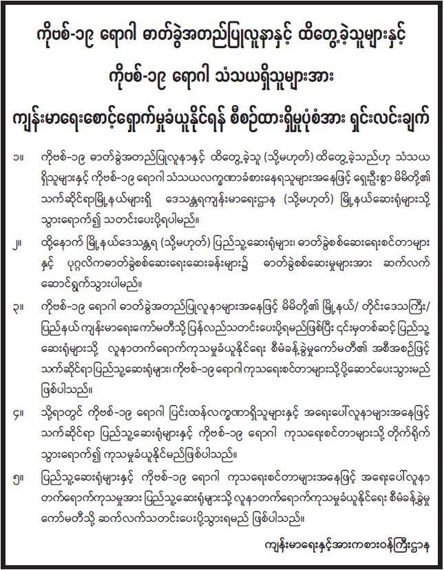 ကိုဗစ်-၁၉ ရောဂါ ဓာတ်ခွဲအတည်ပြုလူနာနှင့် ထိတွေ့ခဲ့သူများနှင့် ကိုပစ်-၁၉ ရောဂါ သံသယရှိသူများအား ကျန်းမာရေးစောင့်ရှောက်မှုခံယူနိုင်ရန် စီစဉ်ထားရှိမှုပုံစံအား ရှင်းလင်းချက် 07/22/2021