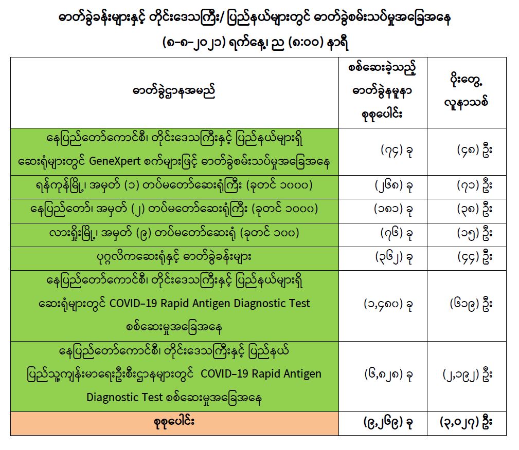 (၈-၈-၂၀၂၁) ရက်နေ့၊ ည (၈:၀၀)နာရီ (၇-၈-၂၀၂၁)ရက်နေ့၊ ည (၈:၀၀)နာရီမှ (၈-၈-၂၀၂၁)ရက်နေ့၊ ည (၈:၀၀)နာရီအတွင်း ဓာတ်ခွဲနမူနာစုစုပေါင်း (၉,၂၆၉)ခုအား စစ်ဆေးပြီးစီးခဲ့ရာ COVID-19 ရောဂါ ဓာတ်ခွဲအတည်ပြုလူနာသစ် (၃,၀၂၇)ဦးတွေ့ရှိရပါသည်။ သို့ဖြစ်ပါ၍ ယနေ့အထိ ဓာတ်ခွဲနမူနာစုစုပေါင်း (၃,၂၅၇,၅၈၉)ခုအား စစ်ဆေးခဲ့ပြီး COVID-19 ဓာတ်ခွဲအတည်ပြုလူနာ စုစုပေါင်း (၃၂၉,၅၁၆) ဦး ရှိပြီ ဖြစ်ပါသည်။ ယနေ့တွင် ဆေးရုံဆင်းခွင့်ရရှိသူ (၄,၉၈၄) ဦး ဖြစ်သဖြင့် ယနေ့အထိ စုစုပေါင်း (၂၄၃,၇၃၁) ဦး ဆေးရုံမှ ဆင်းခွင့်ရရှိပြီး ဖြစ်ပါသည်။ COVID-19 ရောဂါဖြင့် ထပ်မံသေဆုံးသူ (၂၅၀) ဦး ရှိသဖြင့် ယနေ့အထိ သေဆုံးသူစုစုပေါင်း (၁၁,၇၇၆) ဦး ရှိပါသည်။ ပြည်သူလူထုအနေဖြင့် COVID-19 ရောဂါ ကူးစက်ပြန့်ပွားမှုကို ထိန်းချုပ်နိုင်ရေးအတွက် - • တတ်နိုင်သမျှ အိမ်တွင်း၌သာနေထိုင်ခြင်း၊ နေအိမ်ပြင်ပသို့သွားရောက်ရန်ရှိပါက ပါးစပ်နှင့်နှာခေါင်းစည်း (Mask)ကို မဖြစ်မနေစနစ်တကျတပ်ဆင်ခြင်း၊ လက်ကိုမကြာခဏ ဆေးကြောခြင်း၊ တစ်ဦးနှင့်တစ်ဦး ခပ်ခွာခွာနေထိုင်ခြင်း၊ မိမိတို့နေအိမ်တွင် အသက်(၆၅)နှစ်နှင့်အထက် အသက်အရွယ်ကြီးရင့်သူ၊ ဆီးချို၊ သွေးတိုး၊ နှလုံးစသည့် နာတာရှည်ရောဂါ တစ်ခုခုခံစားနေရသူရှိပါက ထိုသူအားပါးစပ်နှင့်နှာခေါင်းစည်းကို တပ်ဆင်ထားစေခြင်းတို့ကိုအထူးဂရုပြု ပူးပေါင်းဆောင်ရွက်ကြပါရန်၊ • ကျန်းမာရေးဝန်ကြီးဌာနမှ ထုတ်ပြန်ထားသည့် “ရုံးလုပ်ငန်းဌာနများတွင် COVID-19 ရောဂါကာကွယ်ရန်အတွက် ဆောင်ရွက်ရမည့် လုပ်ငန်းလမ်းညွှန်” နှင့် “တစ်ဦးကိုတစ်ဦး အသိပေးခြင်း/ သတိပေးခြင်း မိသားစုစီမံချက်” အတိုင်း COVID-19 ရောဂါ ကာကွယ်ရေးနည်းလမ်းများ အားအသိပေးခြင်းနှင့် သတိပေးခြင်းတို့ကို လူတိုင်း၊ မိသားစုတိုင်းမှတက်ကြွစွာပူးပေါင်းပါဝင်ဆောင်ရွက်ကြပါရန် မေတ္တာရပ်ခံပါသည်။ • COVID-19 ရောဂါဆိုင်ရာ သတင်းအချက်အလက်များကို ကျန်းမာရေးဝန်ကြီးဌာန၏ တရားဝင်အင်တာနက်စာမျက်နှာ www.mohs.gov.mmတွင် ဝင်ရောက်ကြည့်ရှုနိုင်ပါသည်။ #Ministry of Health