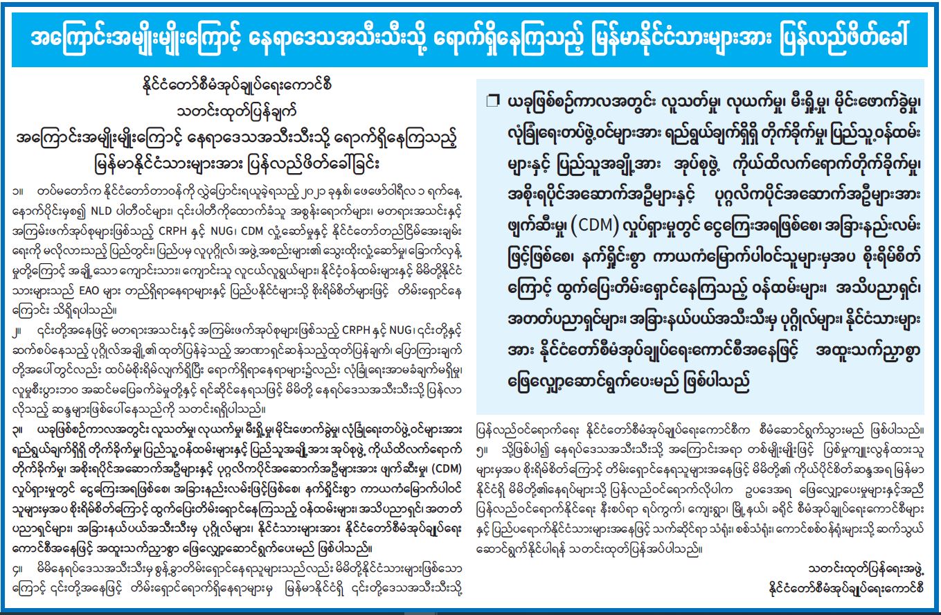 အကြောင်းအမျိုးမျိုးကြောင့် နေရာဒေသအသီးသီးသို့ ရောက်ရှိနေကြသည့် မြန်မာနိုင်ငံသားများအား ပြန်လည်ဖိတ်ခေါ် 08/09/2021