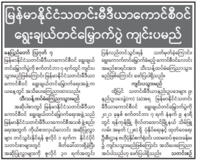 ထို့ပြင် သတင်းမီဒီယာနည်းဥပဒေများ ၉၊ နည်းဥပဒေခွဲ(က) (ခ)အရ မြန်မာနိုင်ငံသတင်း မီဒီယာ ကောင်စီဝင် ရွေးချယ်တင်မြှောက်ပွဲကို ၂၀၂၁ ခုနှစ် စက်တင်ဘာ ၇ ရက် နံနက် ၉ နာရီ တွင် ရန်ကုန်မြို့ ဗိုလ်တထောင်မြို့နယ် သိမ်ဖြူလမ်း အမှတ် (၂၂၈) ရှိ ပုံနှိပ်ရေးနှင့် ထုတ်ဝေရေး ဦးစီးဌာန ဗဟိုပုံနှိပ်စက်ရုံဝင်း ပထမထပ် စုဝေးခန်းမ ၌ ကျင်းပသွားမည်ဖြစ်ကြောင်း အသိ ပေးကြေညာအပ်ပါသည်ဟု ဖော်ပြပါရှိသည်။