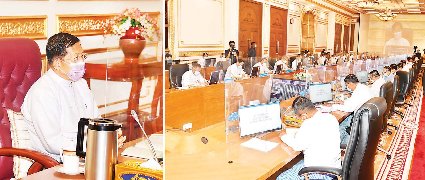 ကိုဗစ်-၁၉ ရောဂါနှင့်ပတ်သက်ပြီး အပတ်စဉ်တိုင်းဒေသကြီးနှင့် ပြည်နယ်အစိုးရ အဖွဲ့များနှင့် Video Conferencing စနစ်ဖြင့်ချိတ်ဆက်တွေ့ဆုံပြီး ရောဂါကူးစက်ပြန့်ပွားမှု ကျဆင်းစေရန် လမ်းညွှန် မှုများ ဆောင်ရွက်လျက်ရှိကြောင်း၊ ပြီးခဲ့သည့် ဇူလိုင်နှင့် ယခုလ ပထမအပတ်တွင် ကိုဗစ်-၁၉ ရောဂါကူးစက်ပြန့်ပွားမှုကြောင့် ဖြစ်ပေါ်ခဲ့သည့် အခက်အခဲများကို ကြိုးပမ်းကျော် လွှားနိုင်ခဲ့ကြောင်း၊ ယခုရက်ပိုင်းတွင် ကိုဗစ်-၁၉ ရောဂါကူးစက် ပြန့်ပွားမှုသည် ၃၀ ရာခိုင်နှုန်းအောက် ကျဆင်းလာသည်ကိုတွေ့ရကြောင်း၊ ယင်းအခြေ အနေကို ကျေနပ်နေ၍ မရဘဲ ရောဂါကူးစက်ပြန့်ပွားမှုကို ထပ်မံကျဆင်းအောင် ကြိုးစားလုပ်ဆောင်ကြရမည် ဖြစ်ကြောင်း၊ ထုတ်ပြန်ထားသည့် အမိန့်၊ ညွှန်ကြားချက်၊ စည်းမျဉ်း စည်းကမ်းများကို ပြည်သူများလိုက်နာရန် တာဝန်ရှိသူများက ကြပ်မတ်ဆောင်ရွက်သွားရန် လိုကြောင်း၊ တစ်ဖက်ကလည်း ကိုဗစ်-၁၉ ရောဂါနှင့် ပတ်သက်သည့် ထုတ်ပြန်ထားသည့် စည်းမျဉ်း စည်းကမ်းများကို သိရှိလိုက်နာမှုရှိစေရန် ပညာပေးလုပ်ငန်းများ ဆောင်ရွက်သွားရန် လိုအပ် ကြောင်း။