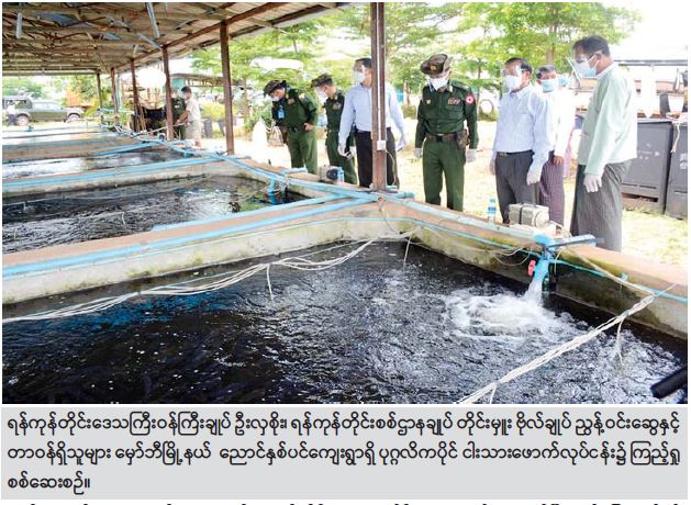 ထိုသို့ ဆောင်ရွက်ပေးလျက်ရှိရာ ဩဂုတ် ၁၄ ရက်တွင် ရန်ကုန်တိုင်းဒေသကြီး ဝန်ကြီးချုပ် ဦးလှစိုး၊ ရန်ကုန်တိုင်းစစ်ဌာနချုပ် တိုင်းမှူး ဗိုလ်ချုပ် ညွန့်ဝင်းဆွေ နှင့် တာဝန်ရှိသူများသည် မှော်ဘီမြို့နယ်၊ ညောင်နှစ်ပင်ကျေးရွာရှိ ပုဂ္ဂလိကပိုင် ငါးသား ဖောက်လုပ်ငန်း၊ ငါးမွေးမြူရေးလုပ်ငန်း၊ ကြက်မွေးမြူရေးလုပ်ငန်းနှင့် ညောင်နှစ်ပင် စိုက်ကွင်း၌ ဓာတုကင်းလွတ်ဟင်းသီးဟင်းရွက်များ စိုက်ပျိုးထားရှိမှုတို့အား လည်း ကောင်း၊ ယနေ့တွင် အနောက်တောင်တိုင်းစစ်ဌာနချုပ် တိုင်းမှူး ဗိုလ်ချုပ် အောင်အောင်နှင့် တာဝန်ရှိသူများသည် ကျုံပျော်မြို့ နယ်မြေခံတပ်ရင်းရှိ ကြက်မွေးမြူ ရေးလုပ်ငန်းနှင့် ဝက်မွေးမြူရေးလုပ်ငန်းများအားလည်းကောင်း အသီးသီးသွားရောက် ကြည့်ရှု၍ တာဝန်ရှိသူများနှင့် တွေ့ဆုံကာ ကုန်ထုတ်လုပ်မှုလုပ်ငန်းများ ရာနှုန်းပြည့် ဆောင်ရွက်နိုင်ရေး လိုအပ်သည်များ ပေါင်းစပ်ညှိနှိုင်း ဆောင်ရွက်ပေးသည်။