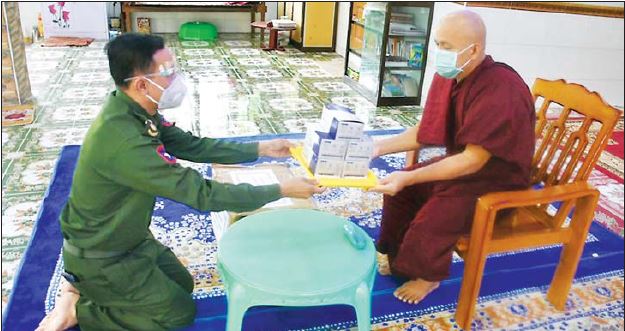 ထိုသို့ ဆောင်ရွက်လျက်ရှိရာ ဩဂုတ် ၁၄ ရက်နှင့်ယနေ့တို့တွင် ရှမ်းပြည်နယ်(မြောက်ပိုင်း)၊ ကွတ်ခိုင် မြို့ရှိ တောင်တန်းသာသနာပြုကျောင်းတိုက်၊ ရန်ကုန်တိုင်းဒေသကြီး၊ ဗိုလ်တထောင် မြို့နယ်၊ အမှတ်(၂)ရပ်ကွက်ရှိ ဓမ္မရက္ခိတ ကျောင်းတိုက်၊ မှော်ဘီမြို့နယ်၊ တပ်ကြီးကုန်း ကျေးရွာရှိ မဟာရတနာလေထီး တပ်ဦးကျောင်းတိုက်၊ ဧရာဝတီတိုင်းဒေသကြီး၊ ဟိုင်းကြီး ကျွန်းမြို့ရှိ သဒ္ဓမ္မဇော်တိ ကာရုံပရိယတ္တိစာသင်တိုက်၊ မန္တလေးတိုင်းဒေသကြီး၊ ပုသိမ်ကြီး မြို့နယ်ရှိ ရေငုံစာသင် တိုက်တို့မှ သံဃာတော်များနှင့် သာသနာနွယ်ဝင် သီလရှင်များအား ဆွမ်းဆန် တော်၊ ဆီ၊ ဆား၊ ပဲ အမယ်(၄)မျိုး၊ ကိုဗစ်-၁၉ ရောဂါ ကာကွယ်ရေး အထောက် အကူပြု ပစ္စည်းများနှင့် လှူဖွယ်ပစ္စည်းများကိုလည်းကောင်း ဧရာဝတီတိုင်း ဒေသကြီး၊ ဟိုင်းကြီး ကျွန်းမြို့ရှိ သဒ္ဓမ္မဇော်တိကာရုံပရိယတ္တိစာသင်တိုက်ရှိ သံဃာတော်မျာအား နေ့ဆွမ်း များကိုလည်းကောင်း သက်ဆိုင်ရာ တိုင်းစစ် ဌာနချုပ်များမှ တာဝန်ရှိသူများက သွား ရောက်၍ ဆက်ကပ် လှူဒါန်းခဲ့ကြကြောင်း သတင်းရရှိသည်။