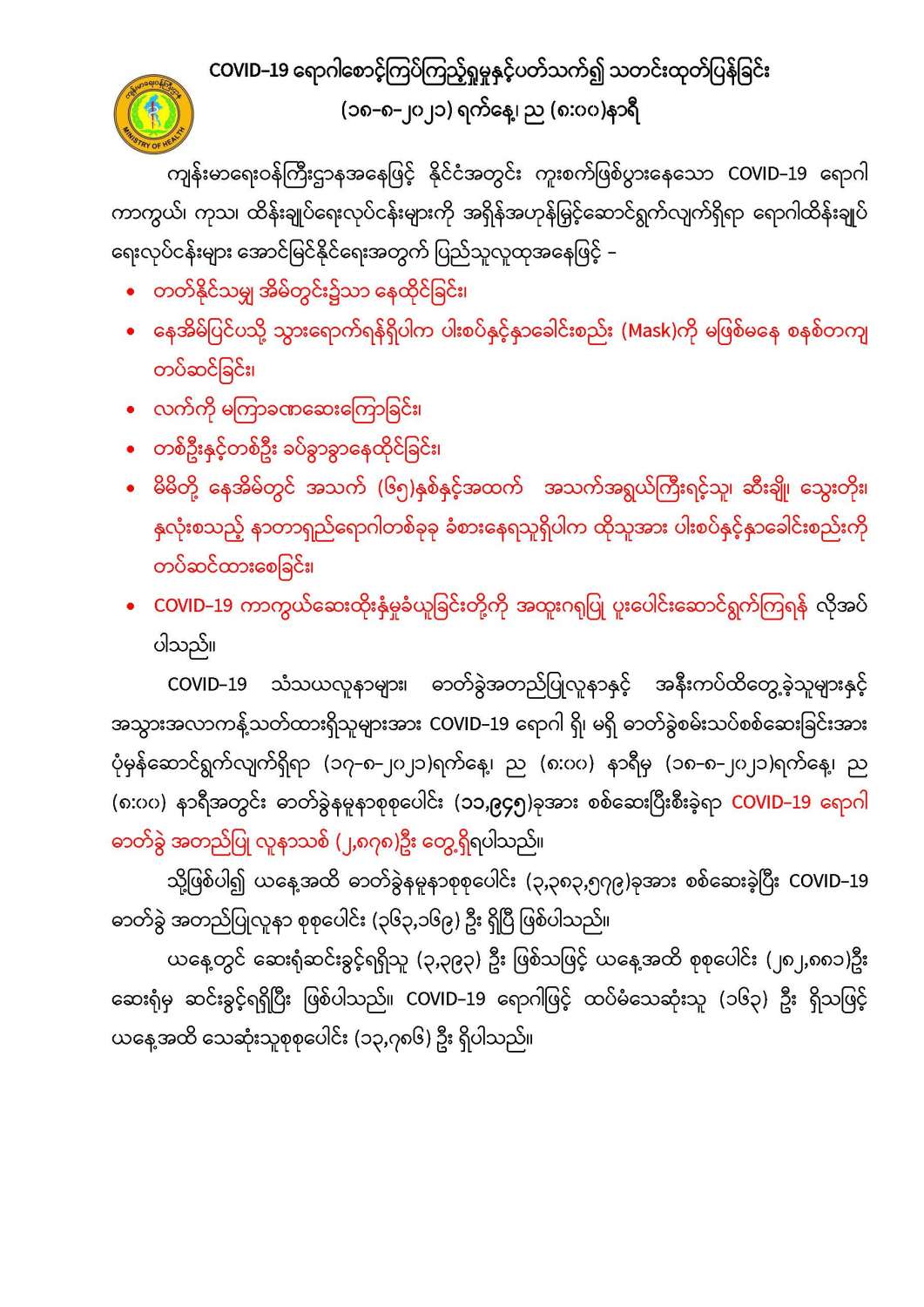 COVID-19 ရောဂါစောင့်ကြပ်ကြည့်ရှုမှုနှင့်ပတ်သက်၍သတင်းထုတ်ပြန်ခြင်း