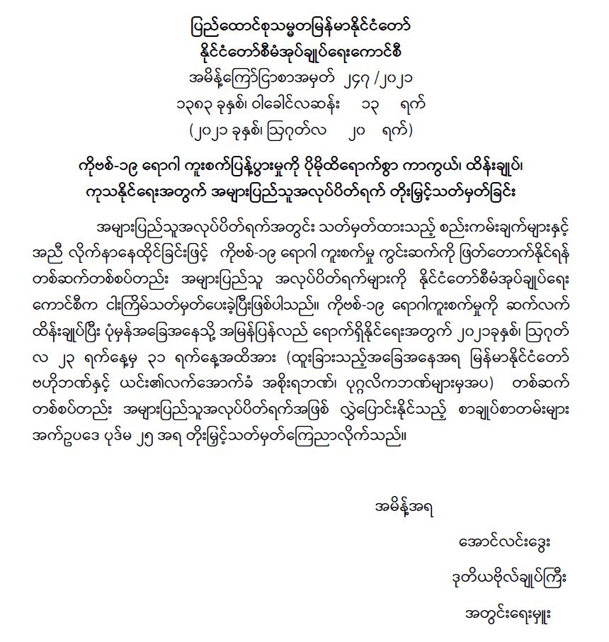 ကိုဗစ်-၁၉ ရောဂါ ကူးစက်ပြန့်ပွားမှုကို ပိုမိုထိရောက်စွာ ကာကွယ်၊ ထိန်းချုပ်၊ ကုသနိုင်ရေးအတွက် အများပြည်သူအလုပ်ပိတ်ရက် တိုးမြှင့်သတ်မှတ်ခြင်း